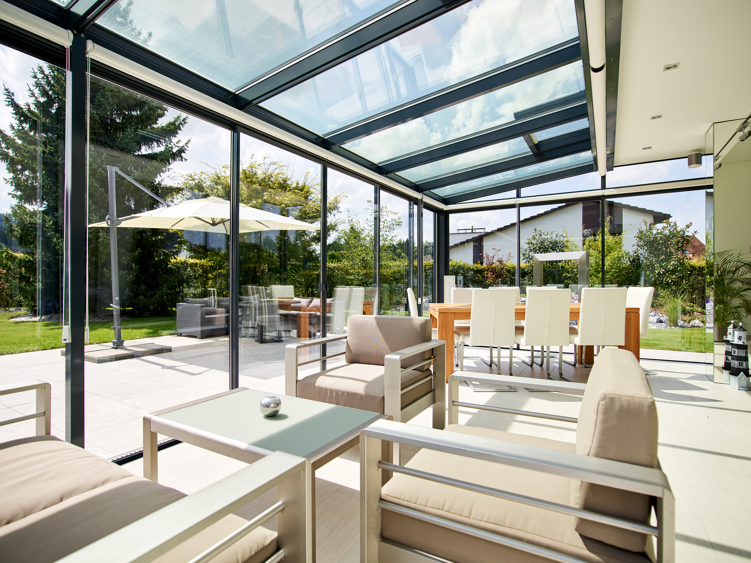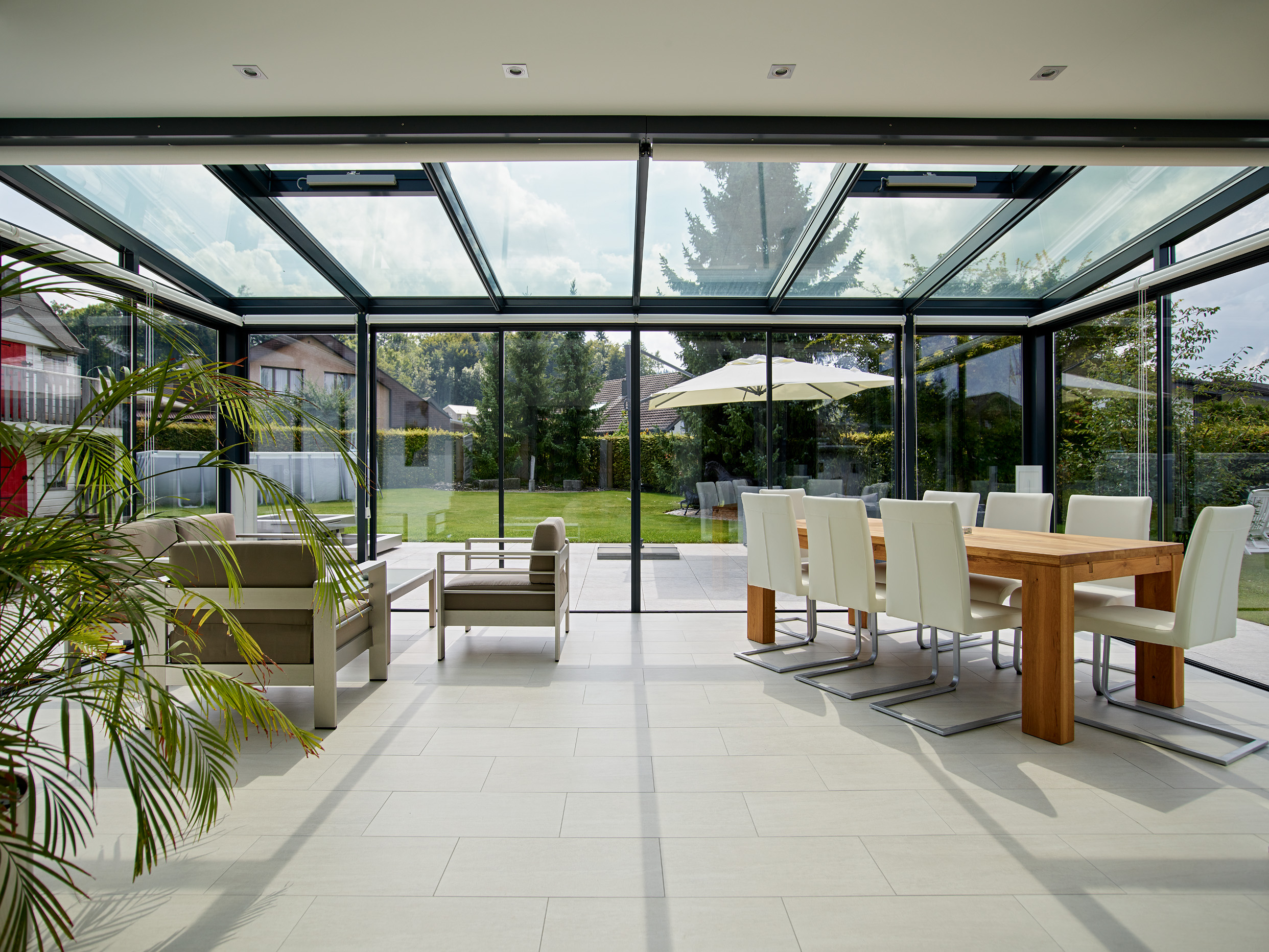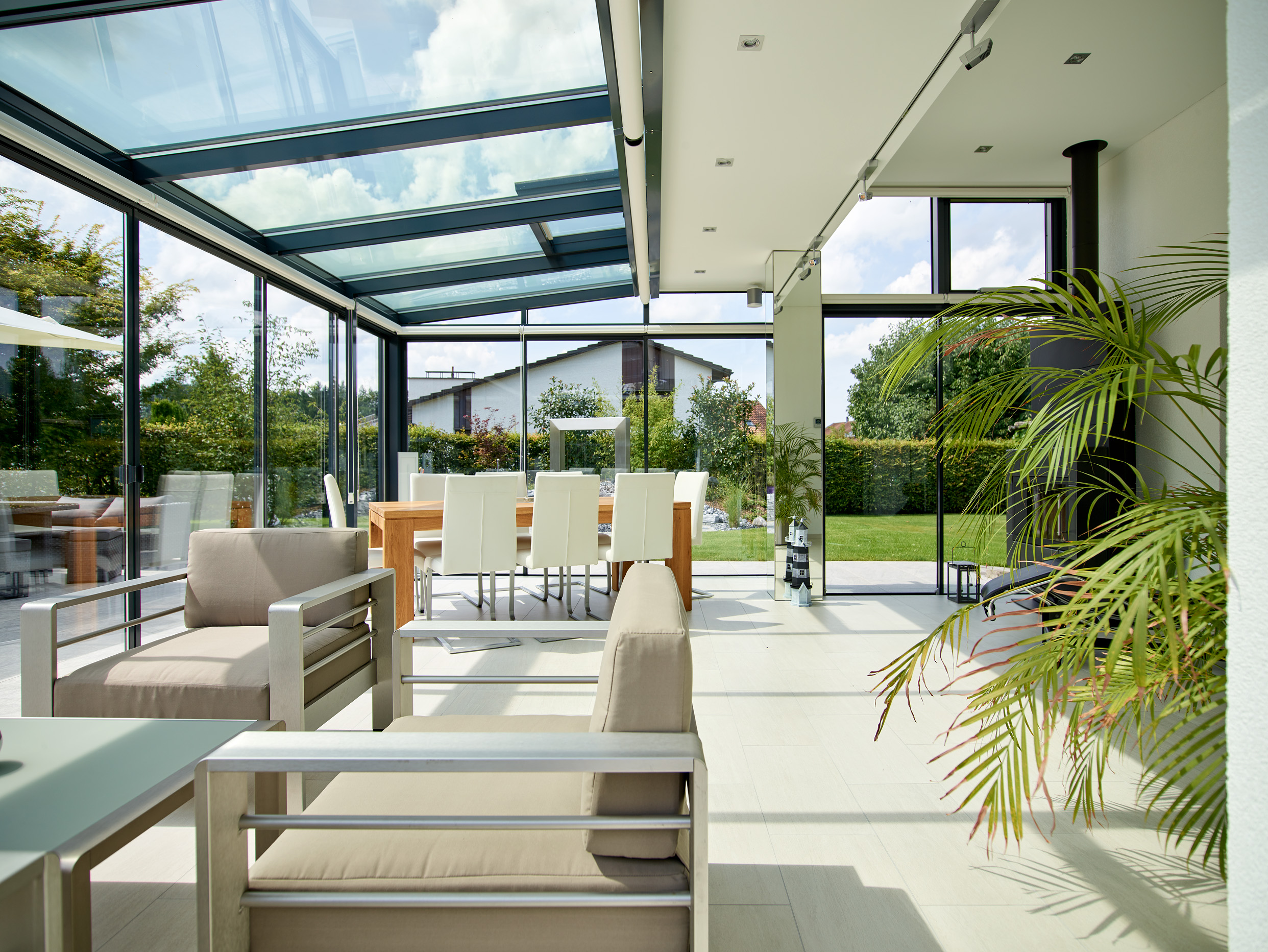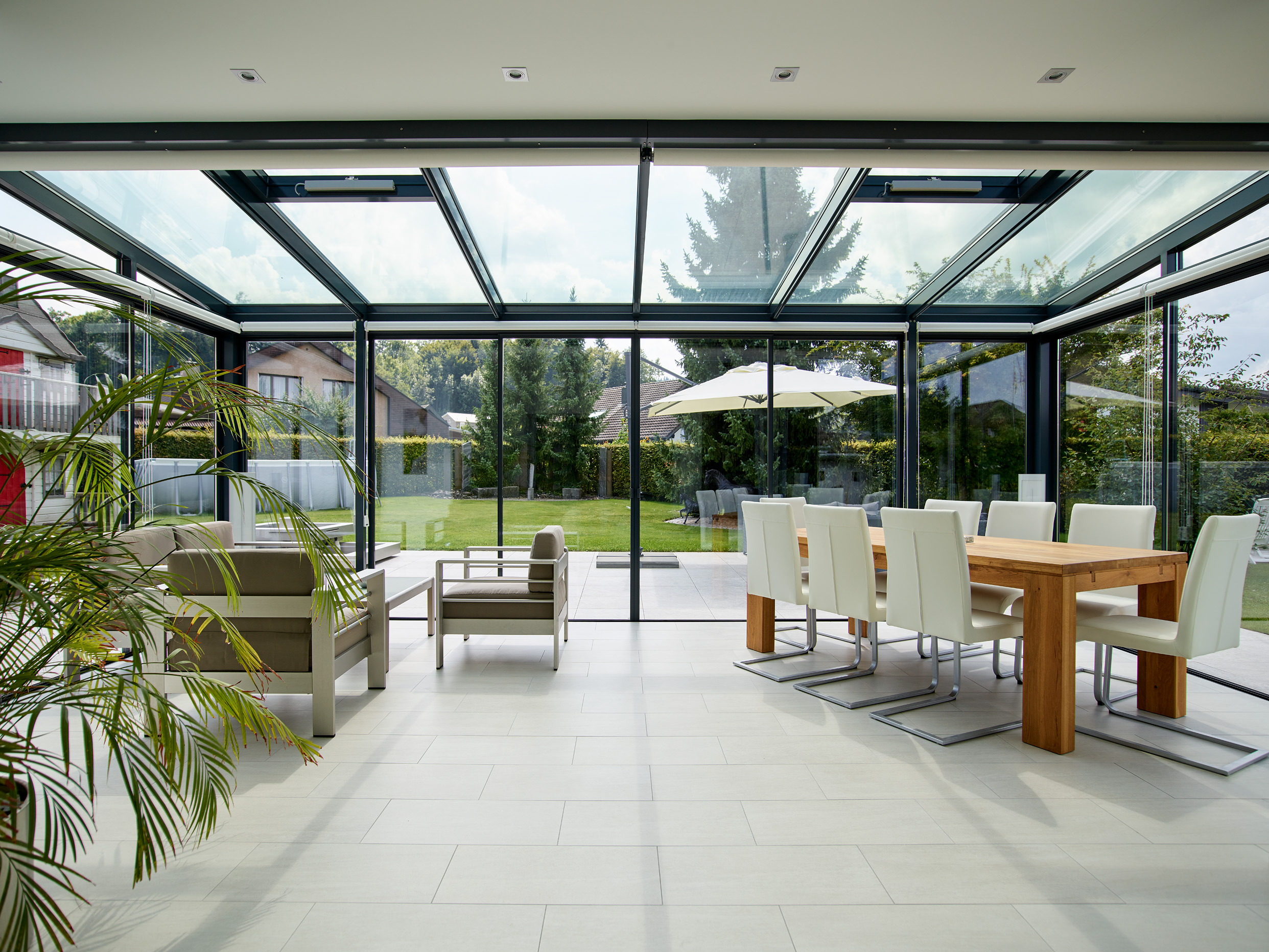 Der ¾-Jahres-Wintergarten der Familie G überzeugt durch seine großzügige Tiefe. Die Erweiterung des Flachdachaußenbereichs mit einer zusätzlichen Isolierglas-Dachverglasung vergrößert die Raumkubatur und eröffnet einen beeindruckenden Blick in den Garten. Dank isolierverglaster Schiebeanlagen und einem Schwedenofen kann der Wintergarten sogar in der kälteren Jahreszeit teilweise genutzt werden.