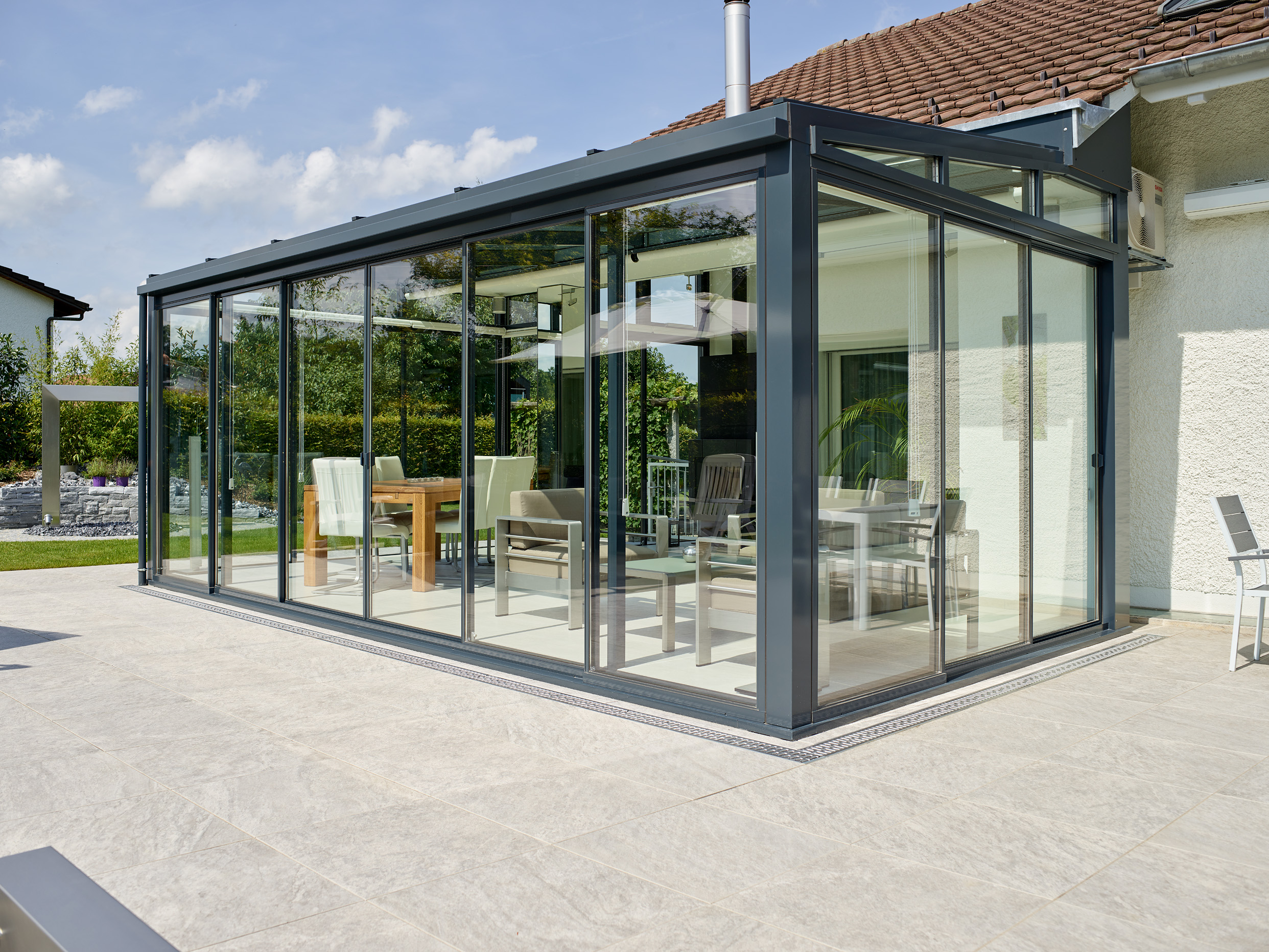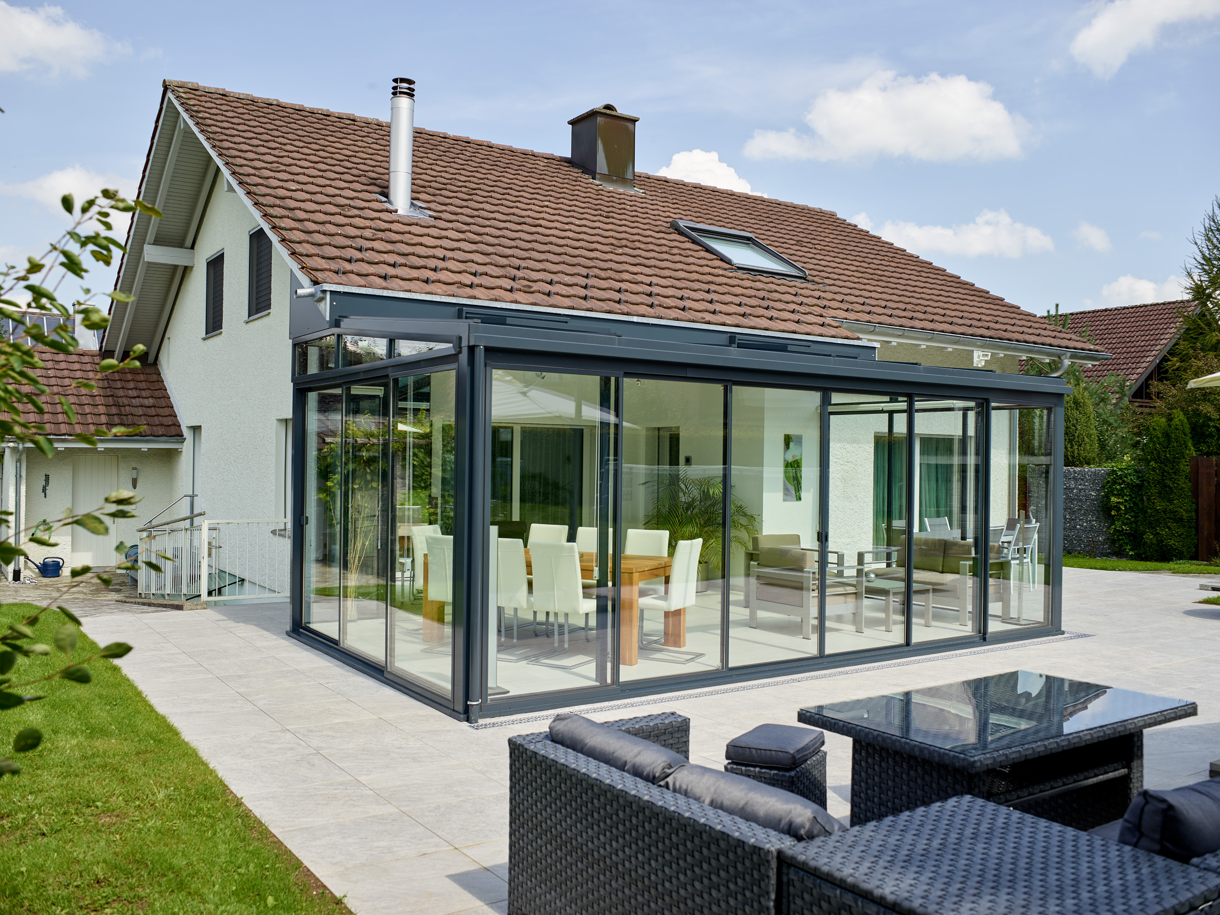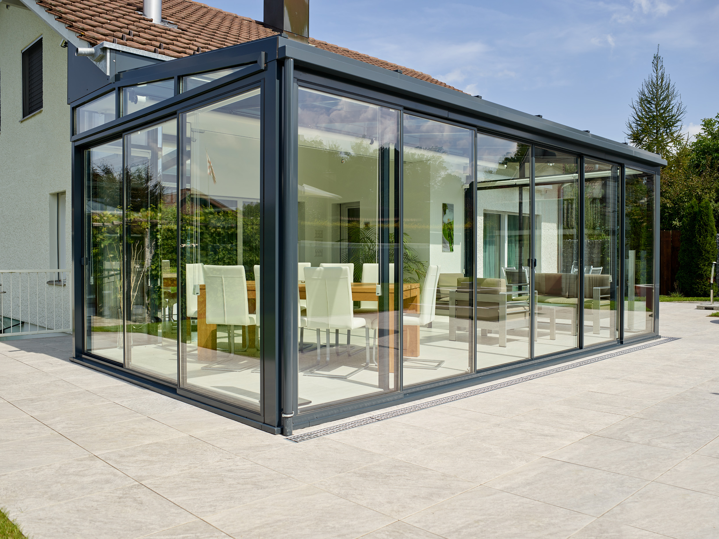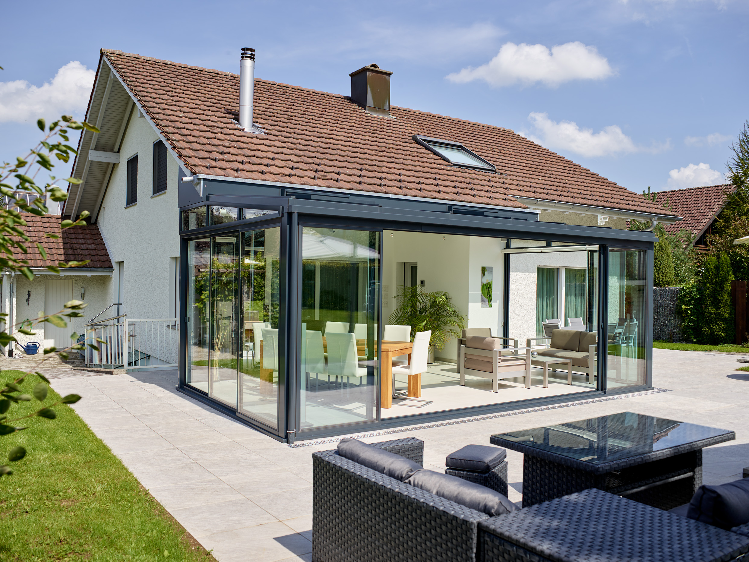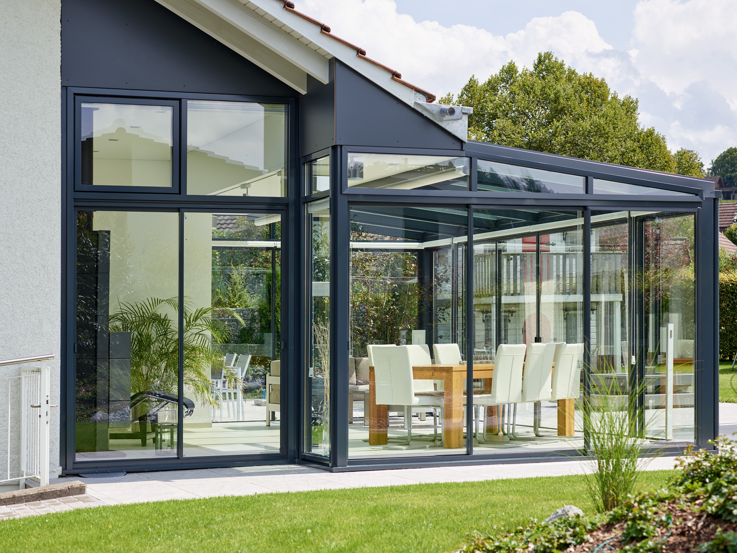 Der ¾-Jahres-Wintergarten der Familie G überzeugt durch seine großzügige Tiefe. Die Erweiterung des Flachdachaußenbereichs mit einer zusätzlichen Isolierglas-Dachverglasung vergrößert die Raumkubatur und eröffnet einen beeindruckenden Blick in den Garten. Dank isolierverglaster Schiebeanlagen und einem Schwedenofen kann der Wintergarten sogar in der kälteren Jahreszeit teilweise genutzt werden.