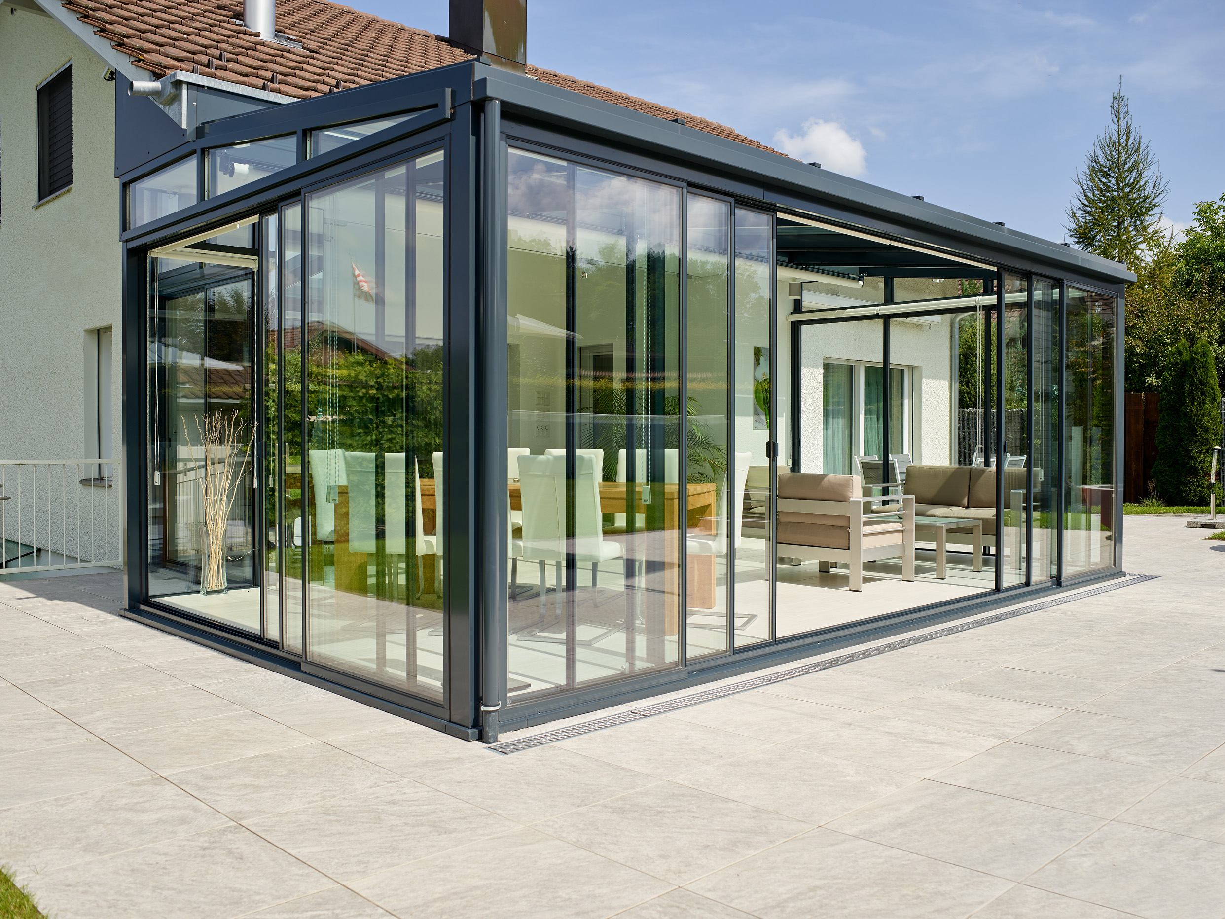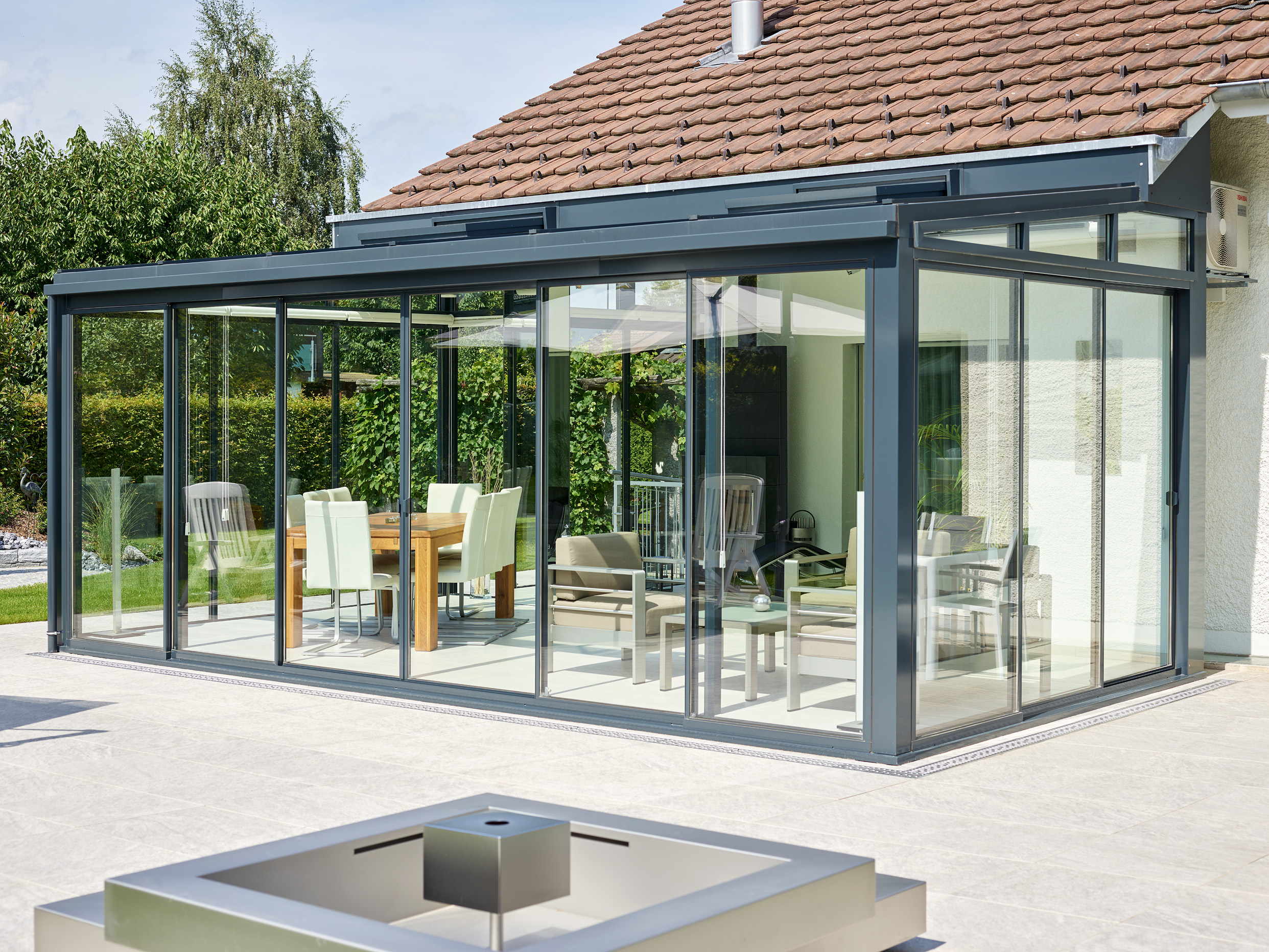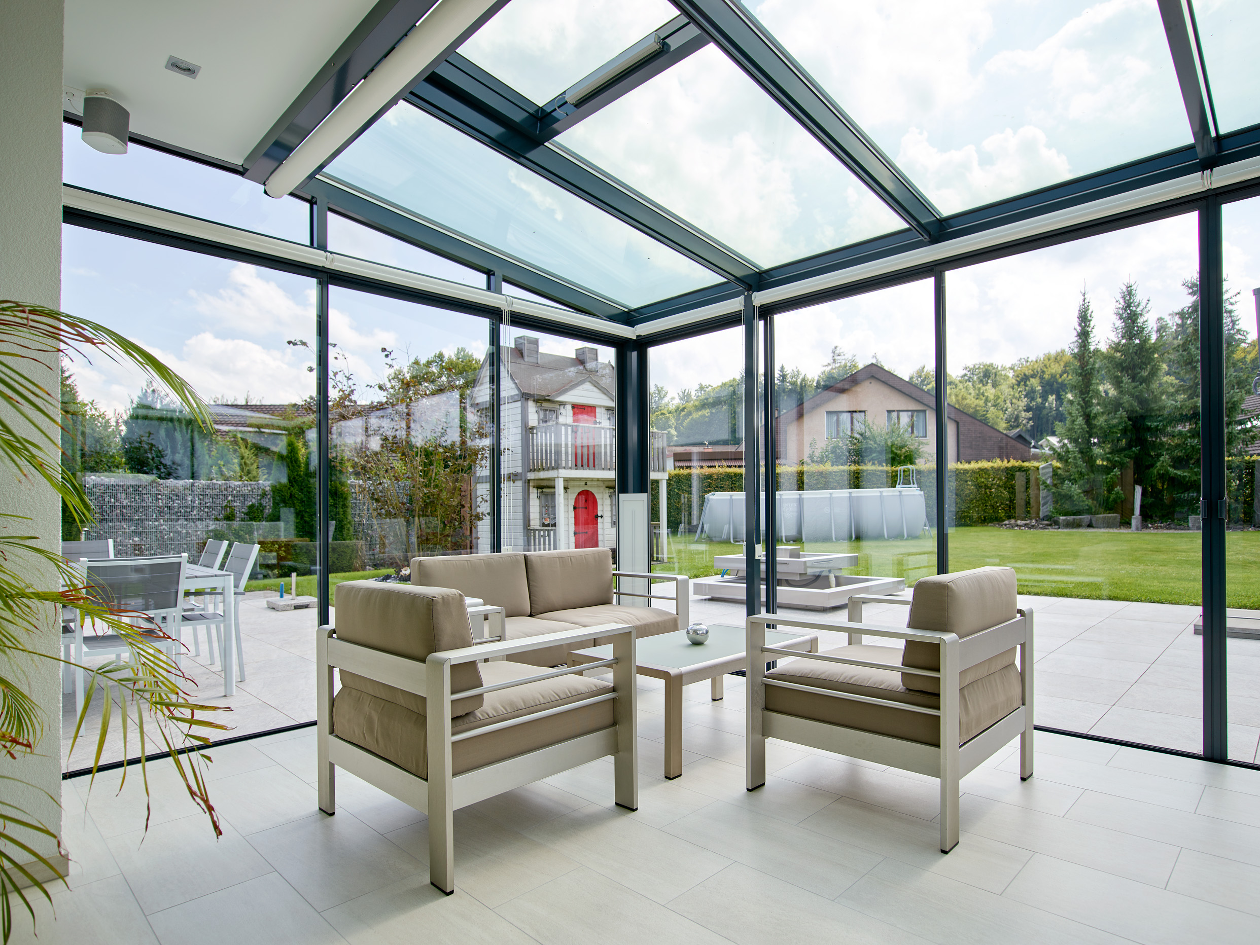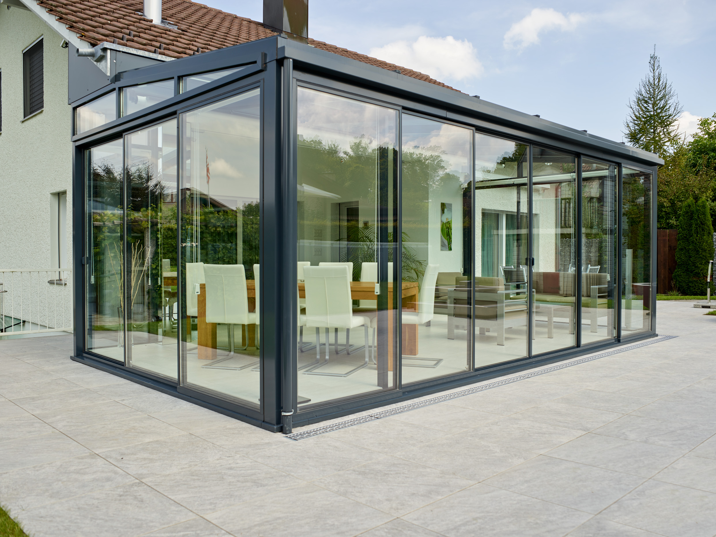 Der ¾-Jahres-Wintergarten der Familie G überzeugt durch seine großzügige Tiefe. Die Erweiterung des Flachdachaußenbereichs mit einer zusätzlichen Isolierglas-Dachverglasung vergrößert die Raumkubatur und eröffnet einen beeindruckenden Blick in den Garten. Dank isolierverglaster Schiebeanlagen und einem Schwedenofen kann der Wintergarten sogar in der kälteren Jahreszeit teilweise genutzt werden.