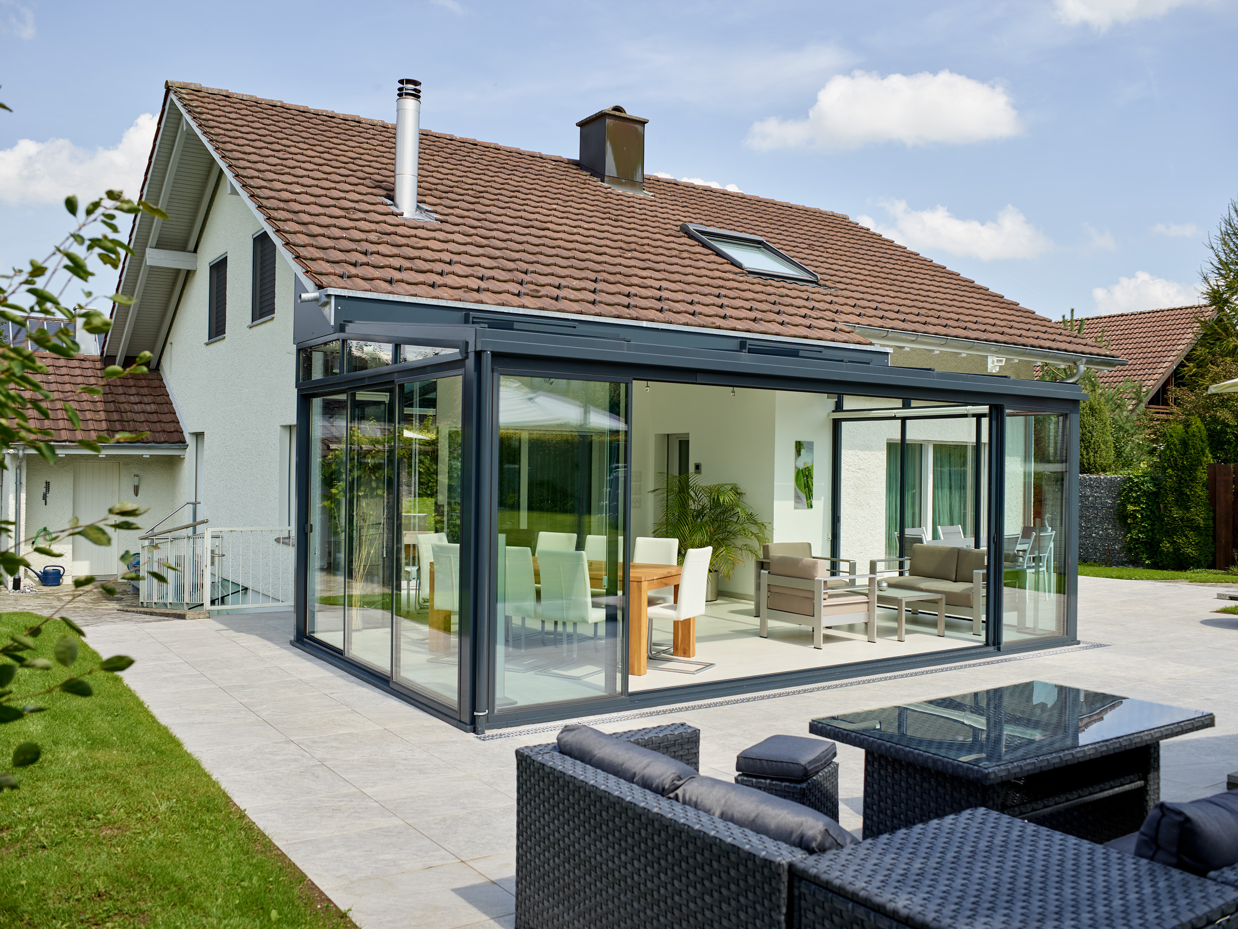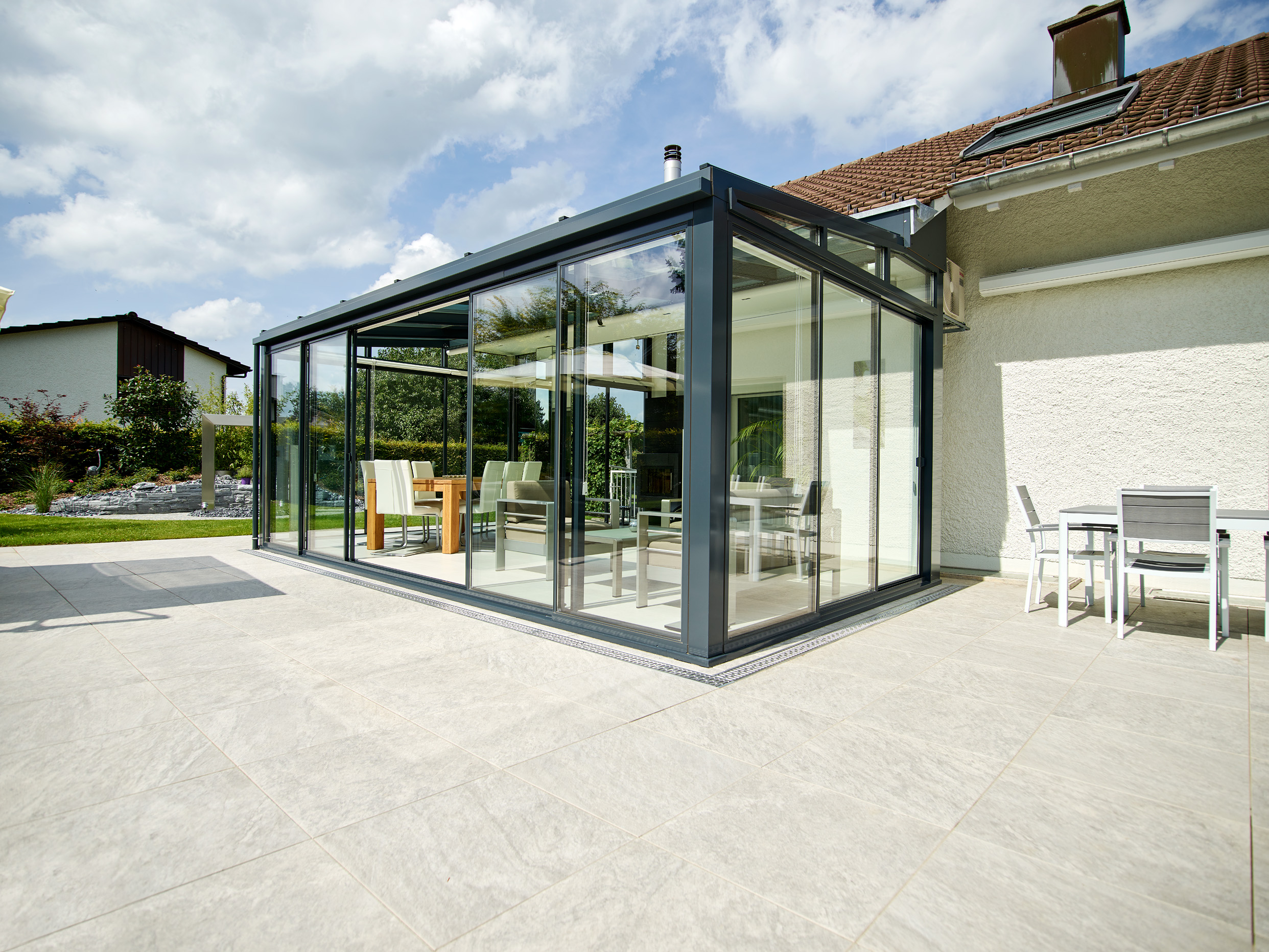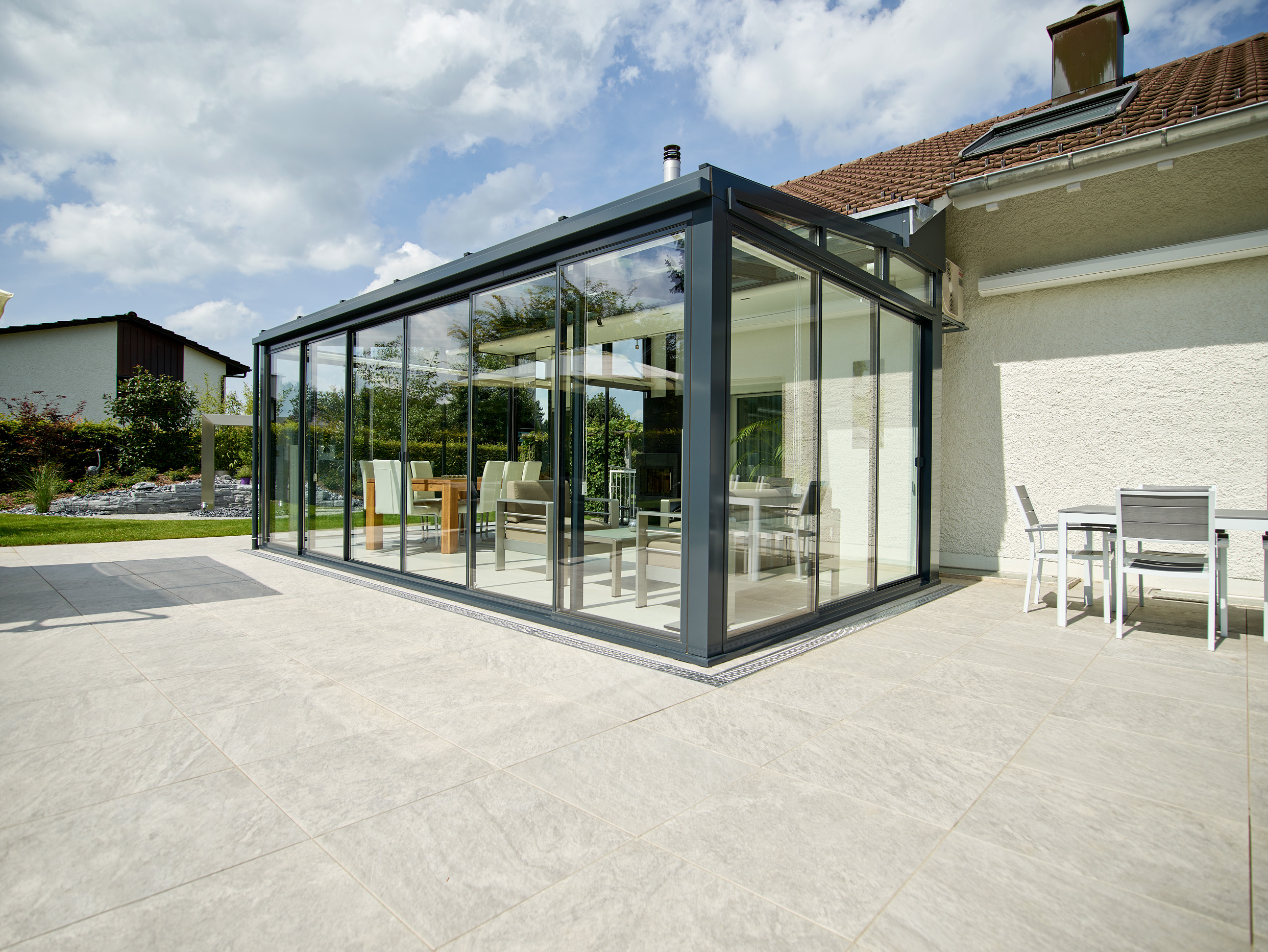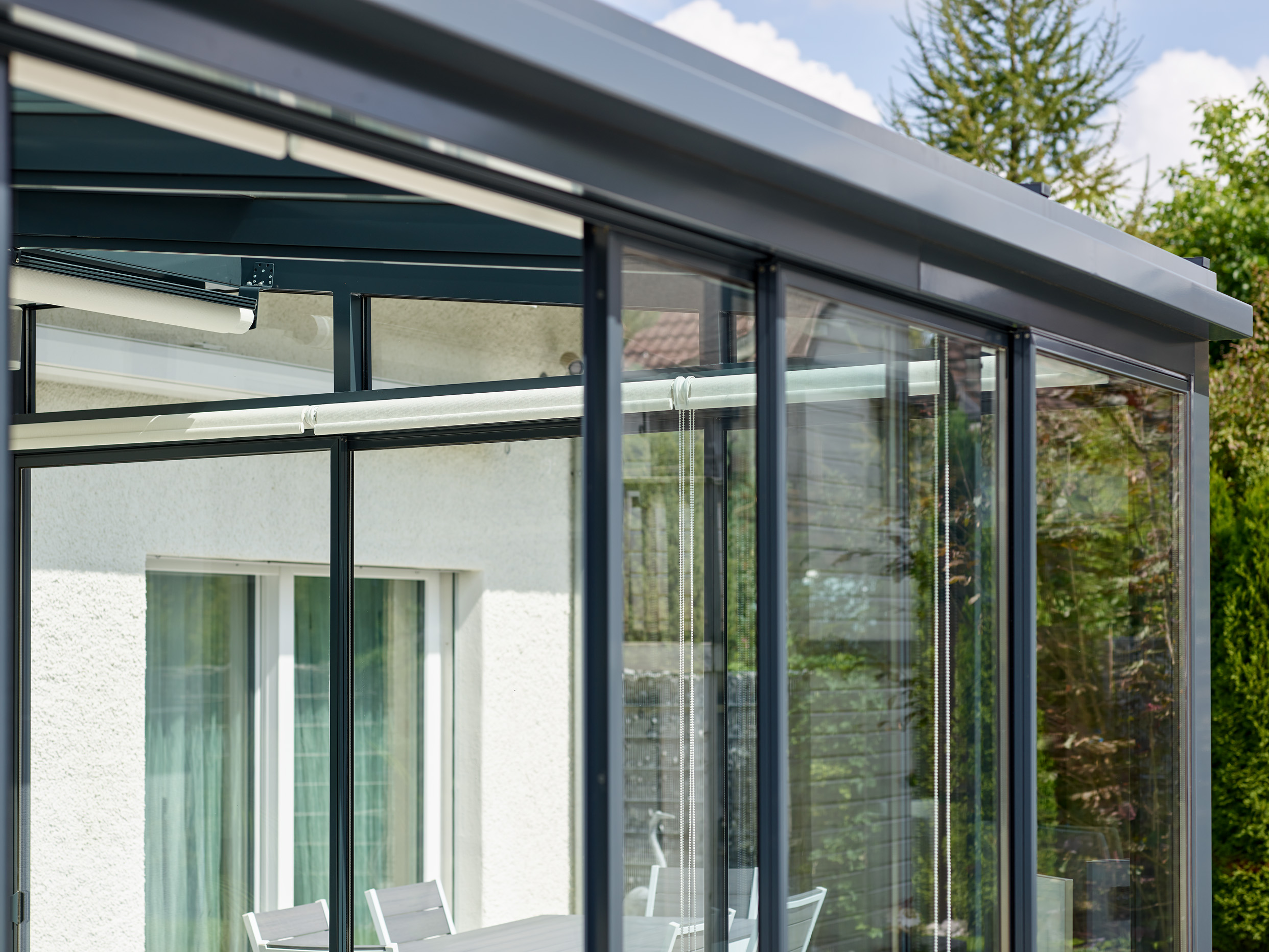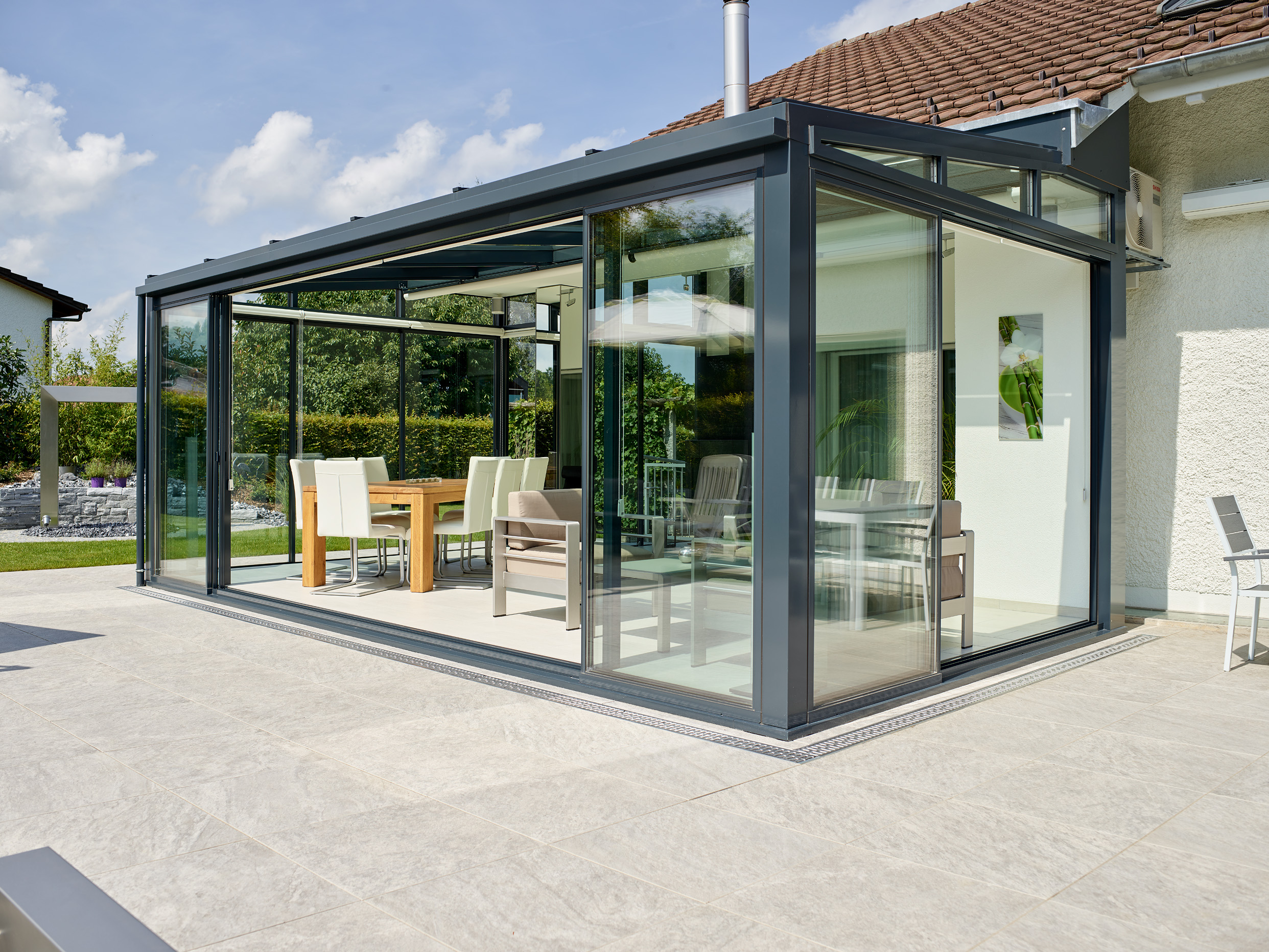 Der ¾-Jahres-Wintergarten der Familie G überzeugt durch seine großzügige Tiefe. Die Erweiterung des Flachdachaußenbereichs mit einer zusätzlichen Isolierglas-Dachverglasung vergrößert die Raumkubatur und eröffnet einen beeindruckenden Blick in den Garten. Dank isolierverglaster Schiebeanlagen und einem Schwedenofen kann der Wintergarten sogar in der kälteren Jahreszeit teilweise genutzt werden.