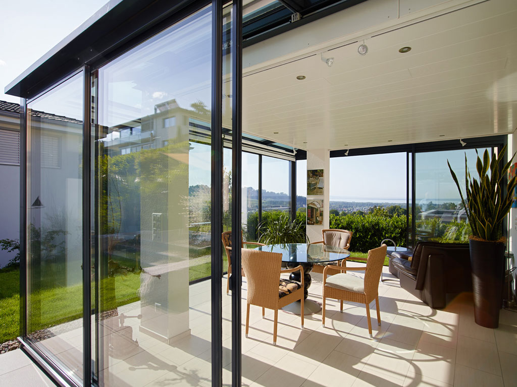 Der kleine Balkon der Familie I wurde durch eine Walmdachverglasung auf drei Seiten erweitert, sodass ein stilvoller, isolierverglaster Wintergarten entstand. Die Balkonuntersicht wurde mit Holz verkleidet und weiß gestrichen, während helle Fliesen dem Innenraum eine freundliche, mediterrane Atmosphäre verleihen. So entstand eine kleine Oase, die rund drei Viertel des Jahres genutzt werden kann – ideal zum gemütlichen Essen oder entspannten Verweilen.