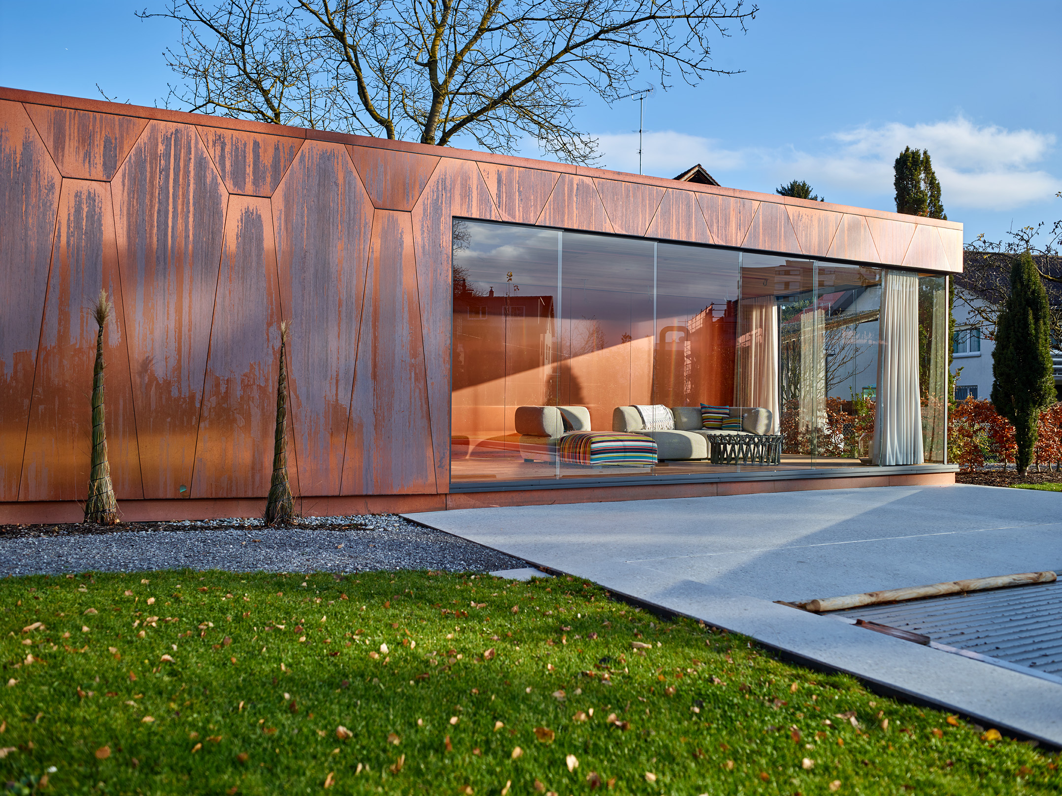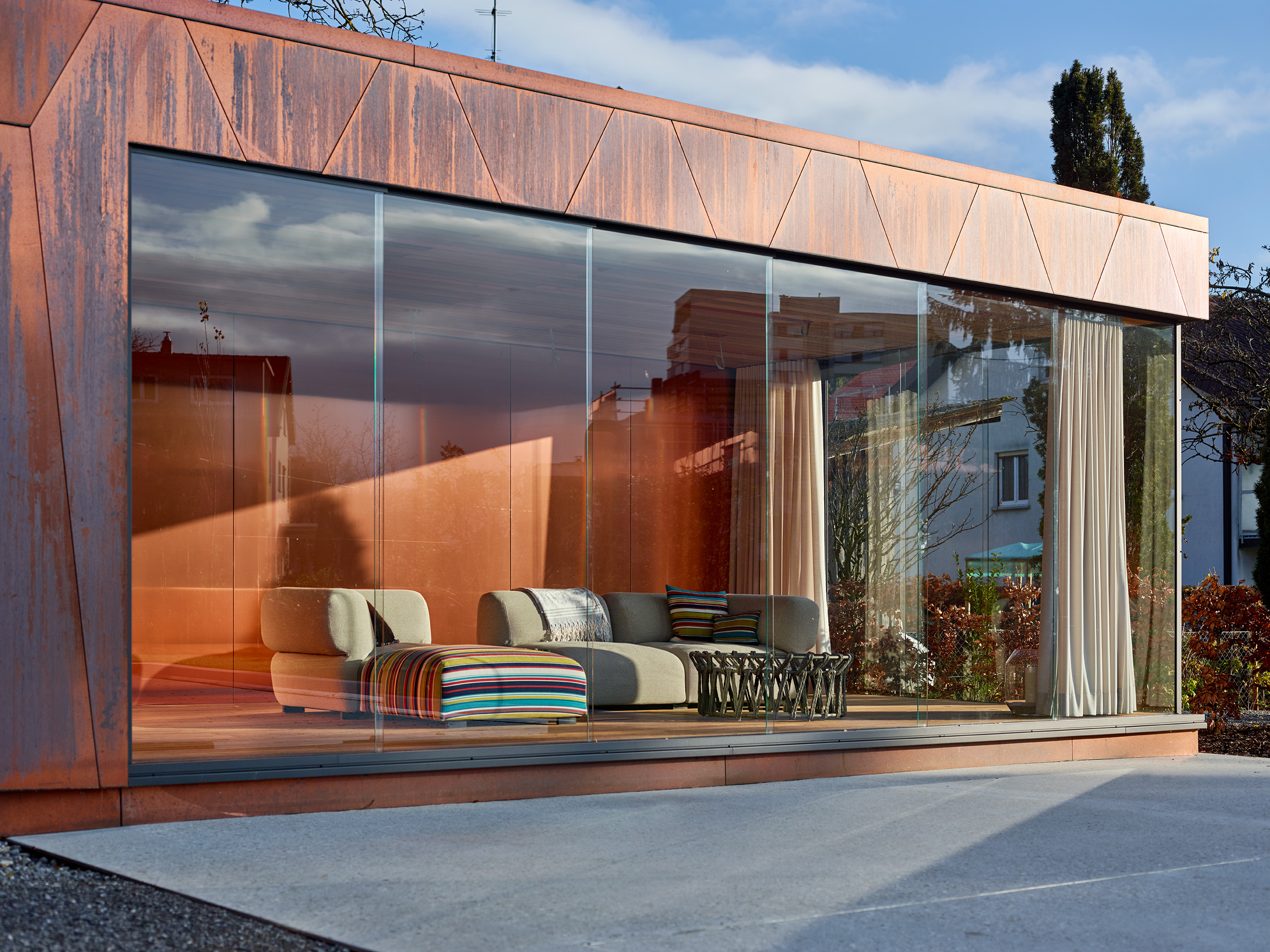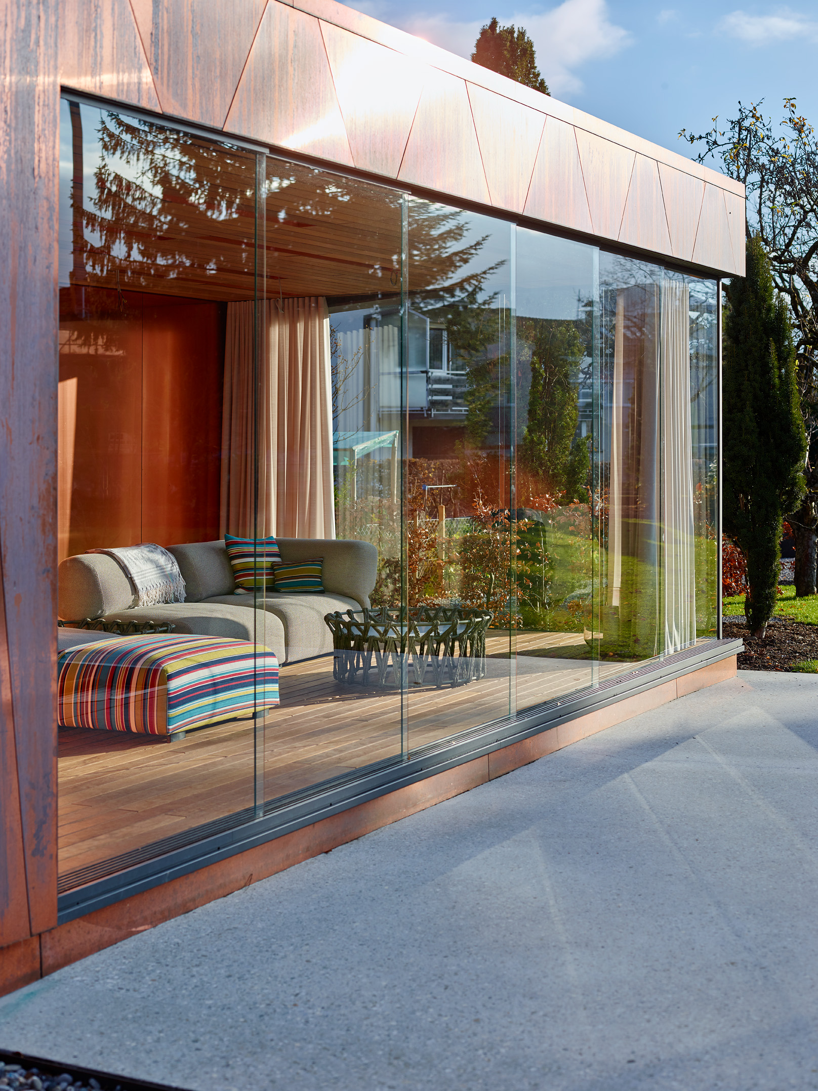 Das Poolhaus der Familie F, entworfen in Zusammenarbeit mit Hoffenscher Architekten, besticht durch ein einzigartiges Design, gepaart mit der Eleganz einfach verglaster Schiebeanlagen. So kann die Familie herrliche Stunden im Poolhaus verbringen, Gäste einladen, Feste feiern oder einfach ihre Tage in geschützter Atmosphäre genießen. Der Ausblick auf Pool und Garten lässt das Herz höher schlagen und die Familie gleichzeitig in vollen Zügen entspannen.