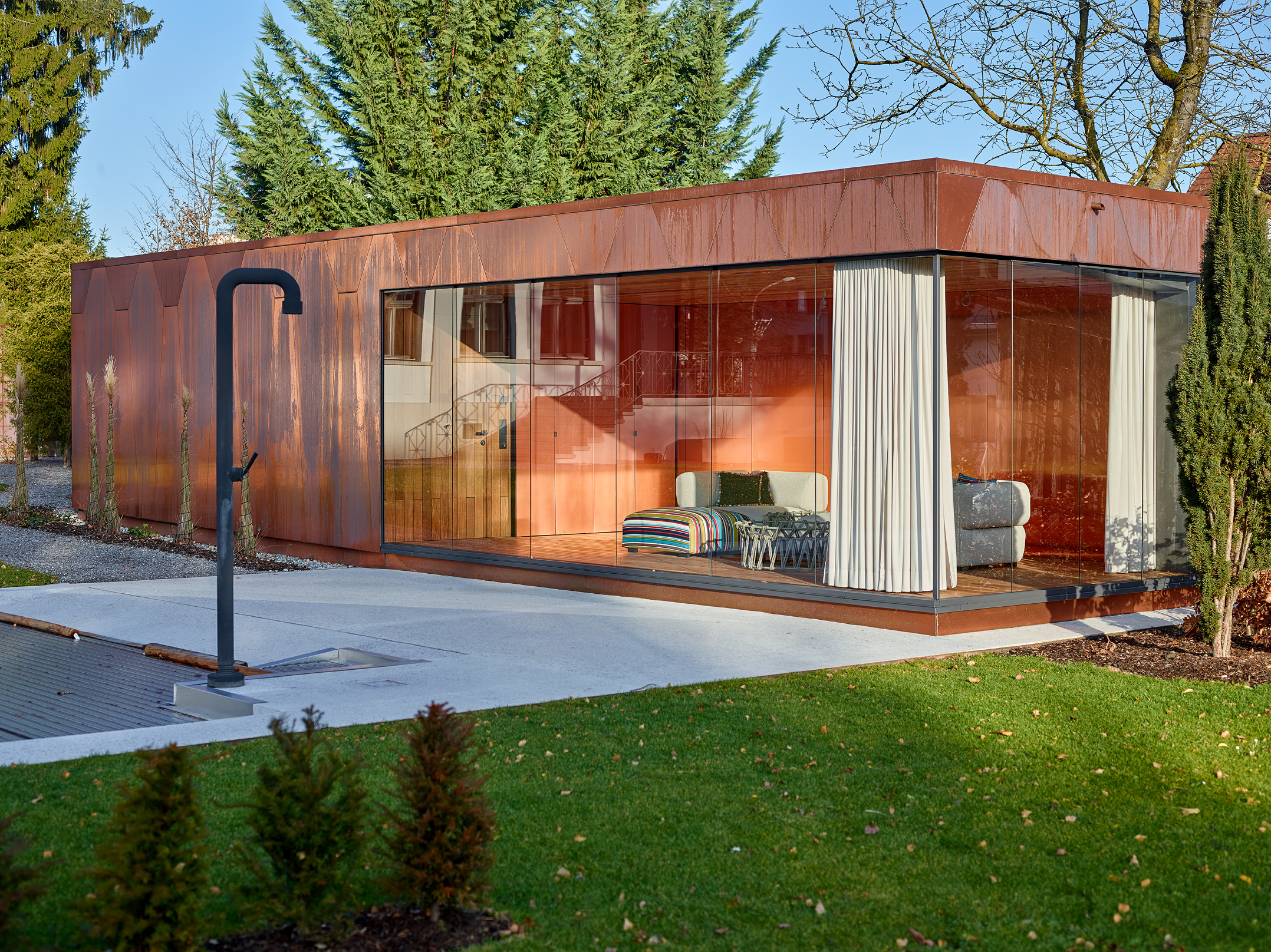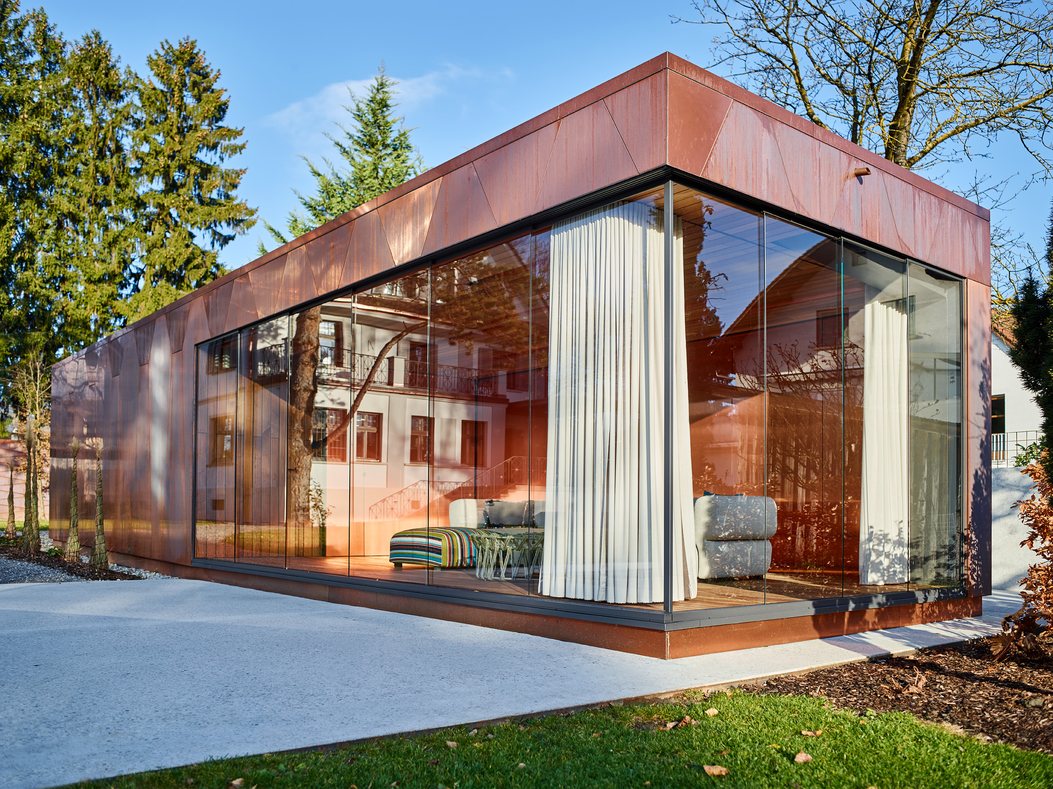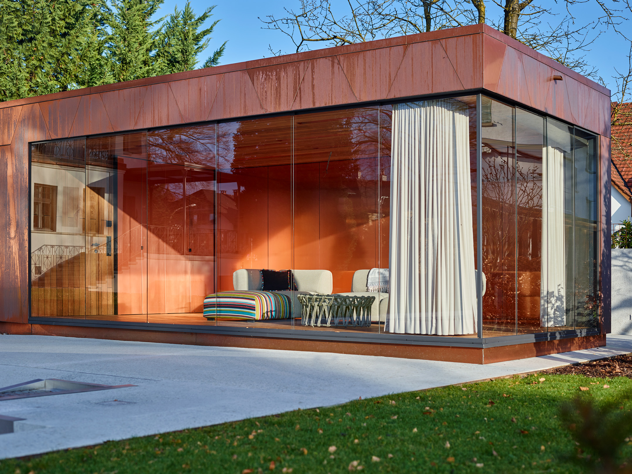 Das Poolhaus der Familie F, entworfen in Zusammenarbeit mit Hoffenscher Architekten, besticht durch ein einzigartiges Design, gepaart mit der Eleganz einfach verglaster Schiebeanlagen. So kann die Familie herrliche Stunden im Poolhaus verbringen, Gäste einladen, Feste feiern oder einfach ihre Tage in geschützter Atmosphäre genießen. Der Ausblick auf Pool und Garten lässt das Herz höher schlagen und die Familie gleichzeitig in vollen Zügen entspannen.