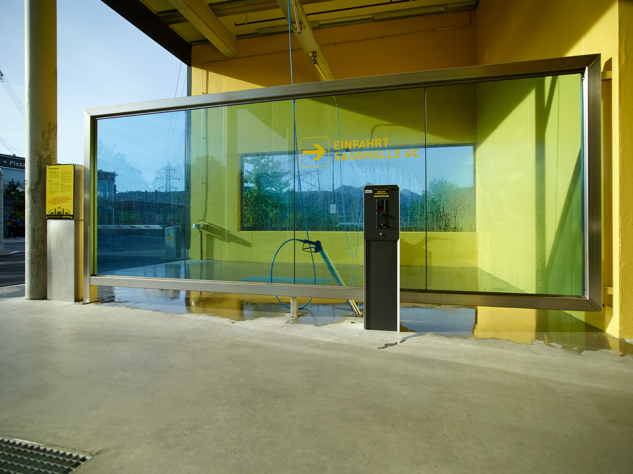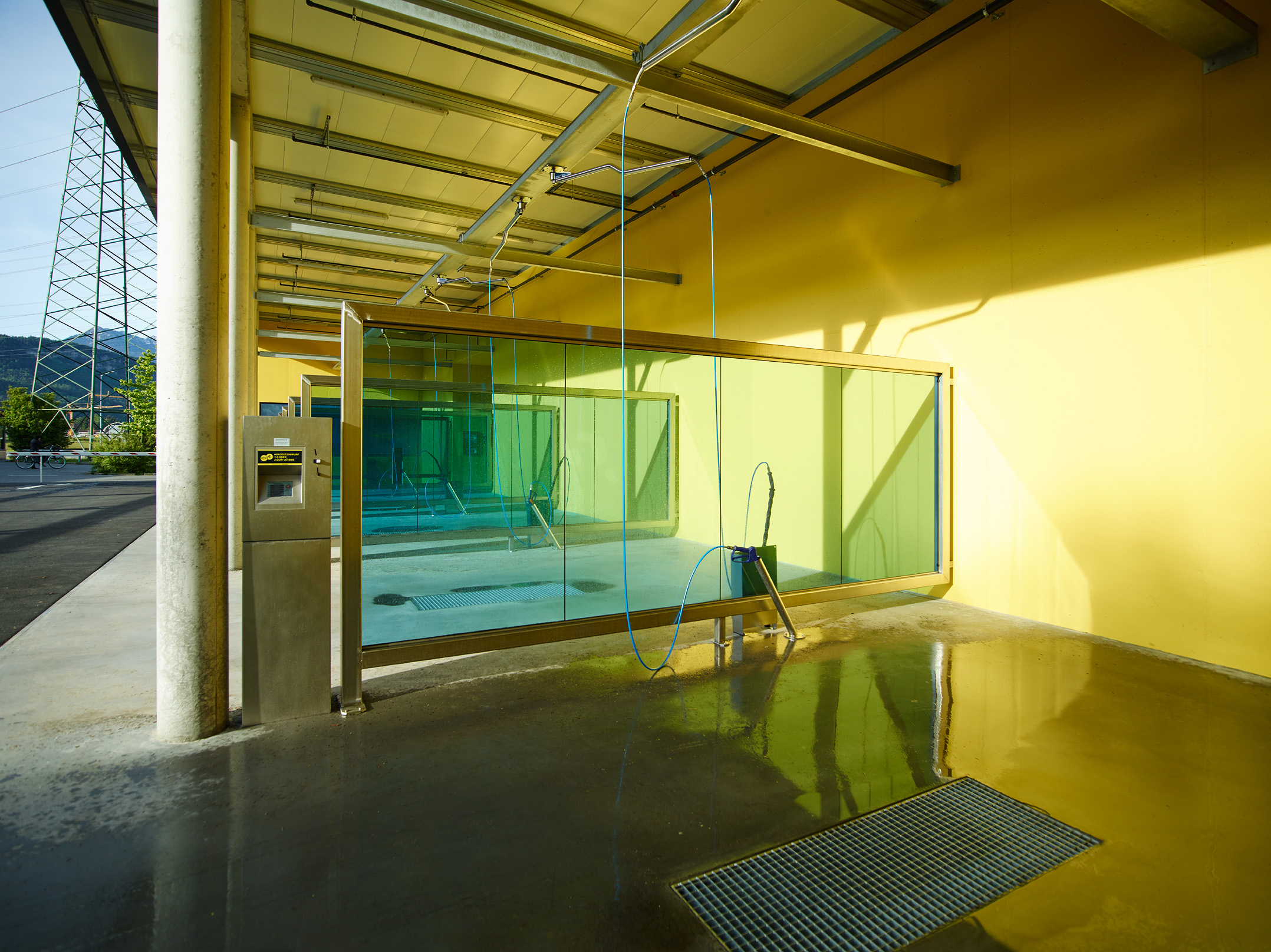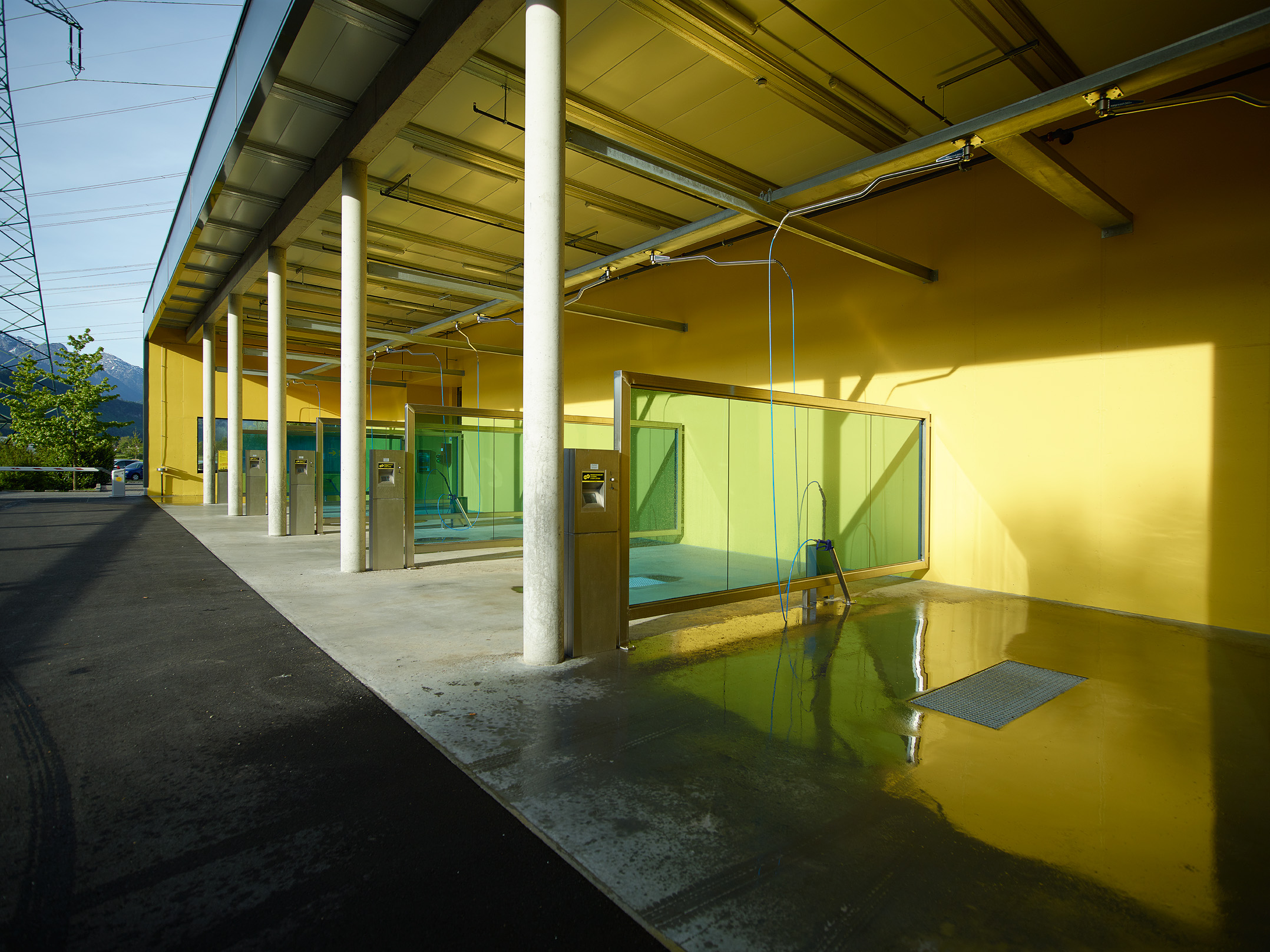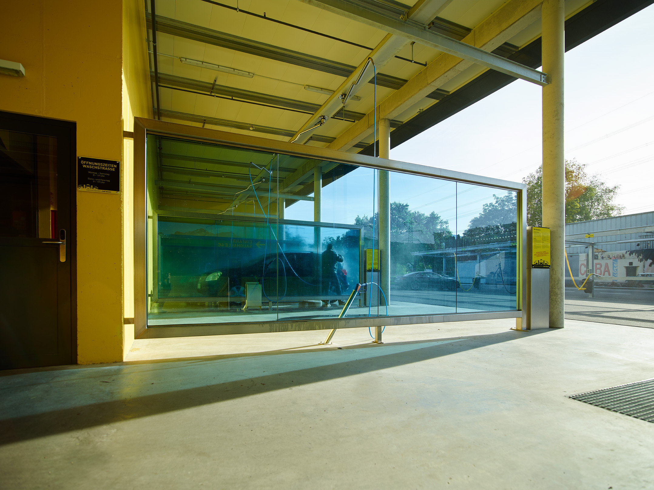 Die Pfosten-Riegel-Fassade der Waschanlage sowie die Verglasungen zwischen Waschanlage und Saugstelle und die Verglasungen der einzelnen Waschkabinen wurden als Einfachverglasung ausgeführt. Während die Fassade keine dauerhafte Isolierung bietet, schützt sie zuverlässig vor Wind und Wetter beim Aussaugen der Fahrzeuge. Die anderen beiden Verglasungen dienen als effektiver Spritzschutz. Zudem zeigt sich bei den Waschboxen, dass die Verglasungen in verschiedenen Farben realisiert werden können.