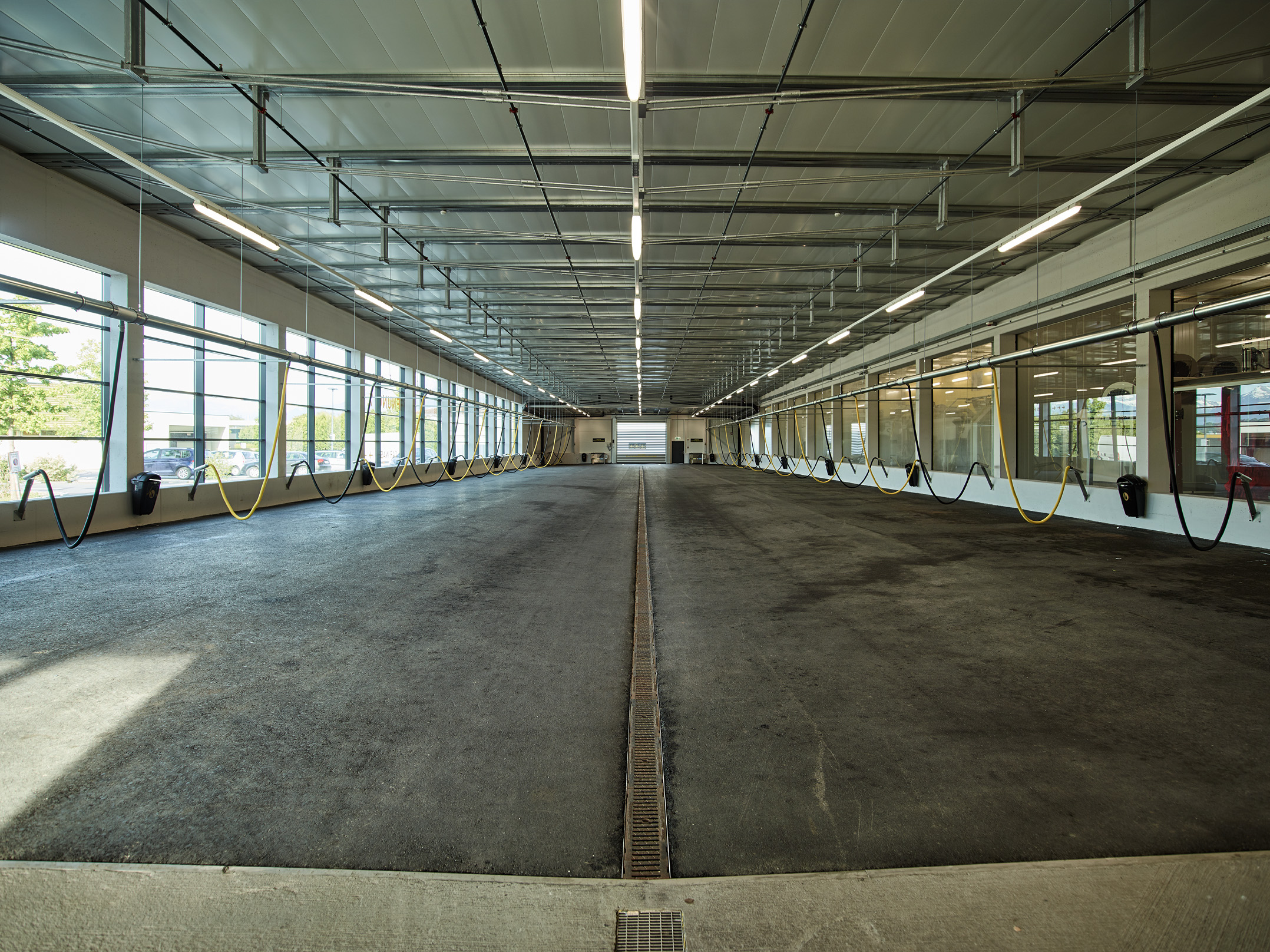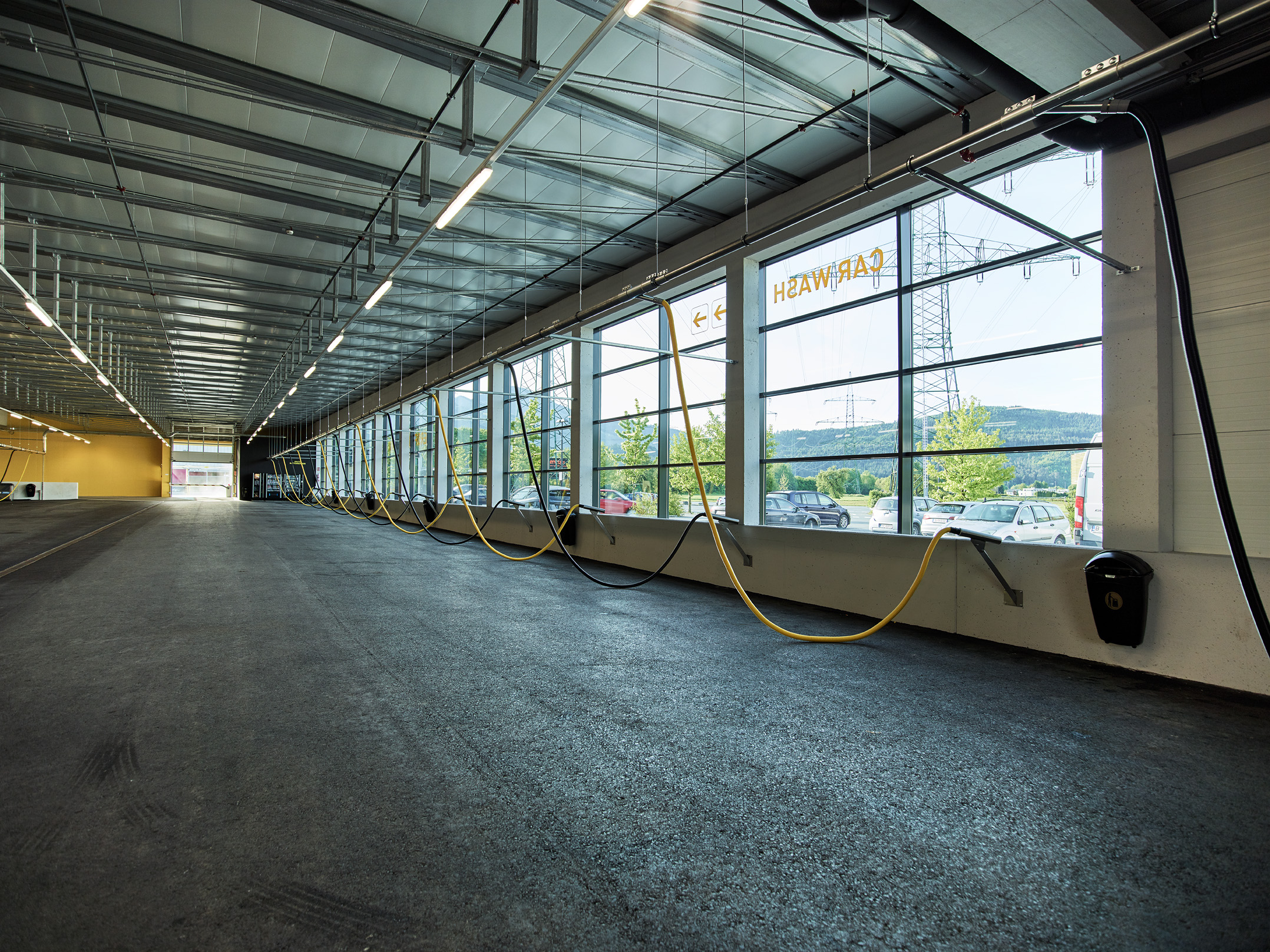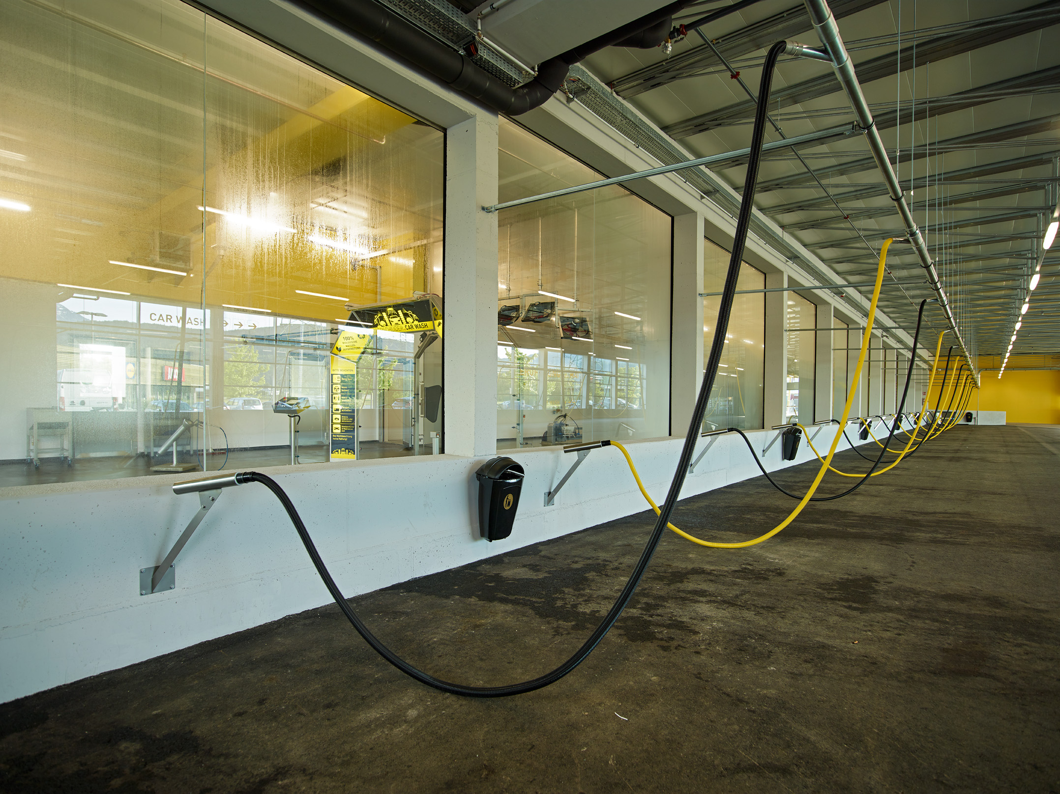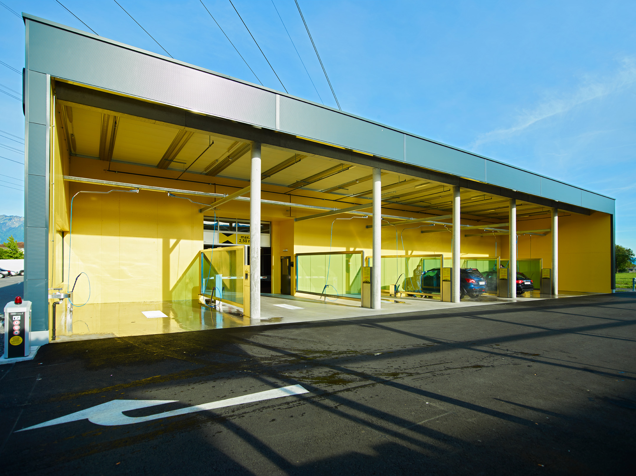 Die Pfosten-Riegel-Fassade der Waschanlage sowie die Verglasungen zwischen Waschanlage und Saugstelle und die Verglasungen der einzelnen Waschkabinen wurden als Einfachverglasung ausgeführt. Während die Fassade keine dauerhafte Isolierung bietet, schützt sie zuverlässig vor Wind und Wetter beim Aussaugen der Fahrzeuge. Die anderen beiden Verglasungen dienen als effektiver Spritzschutz. Zudem zeigt sich bei den Waschboxen, dass die Verglasungen in verschiedenen Farben realisiert werden können.