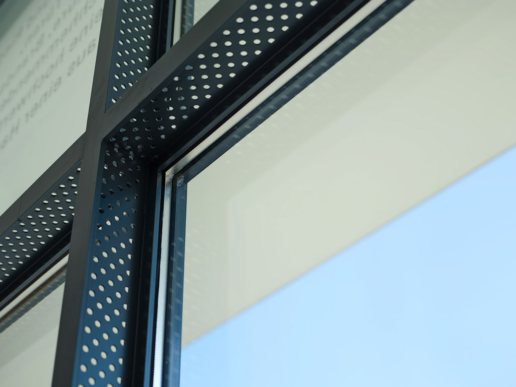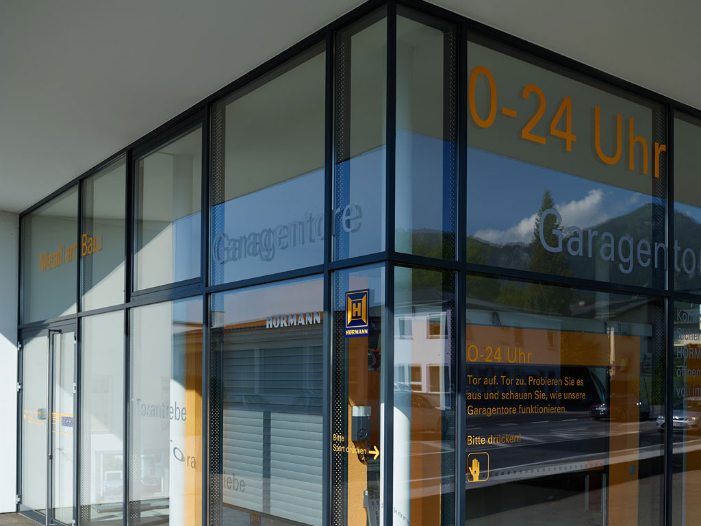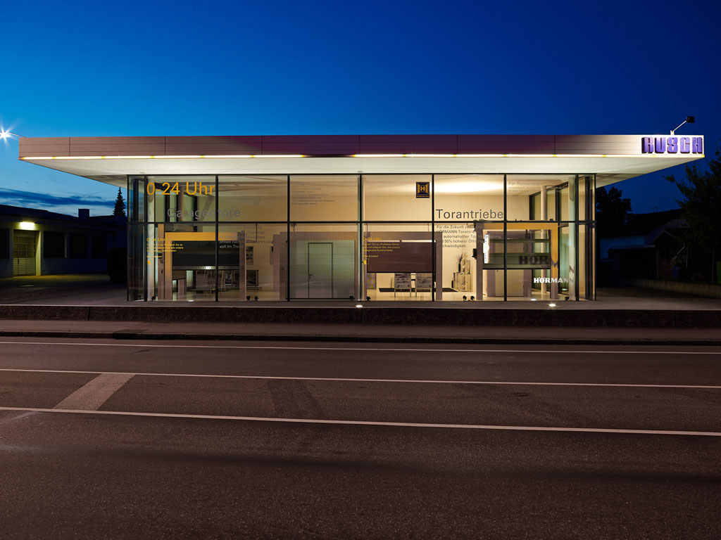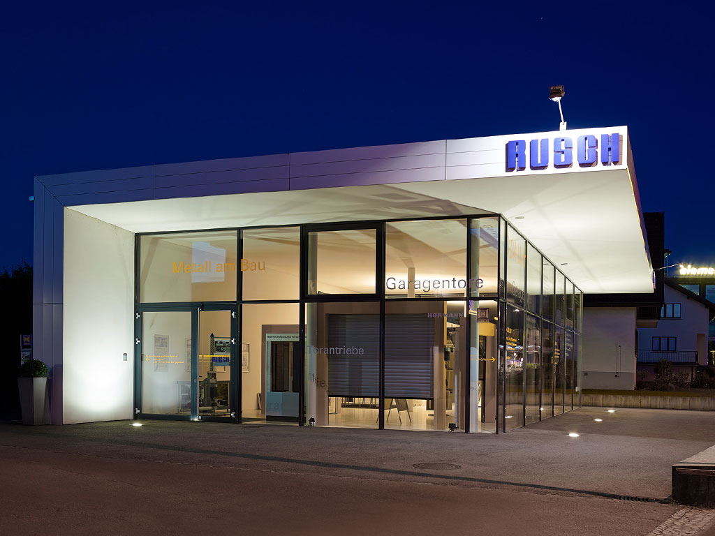 Die Stahlkonstruktion wurde bauseitig gestellt und von uns mit Glaselementen und Kippfenstern versehen. Die Stahlkonstruktion sorgt für eine markante Höhe der unteren Glaselemente sowie Türen. Die Firma Rusch hat so einen wunderbaren Werbeeffekt ihrer Produkte an der Hauptstraße. Das überhängende Flachdach sorgt für einen guten Regen- und Sonnenschutz der Glasfassade.
