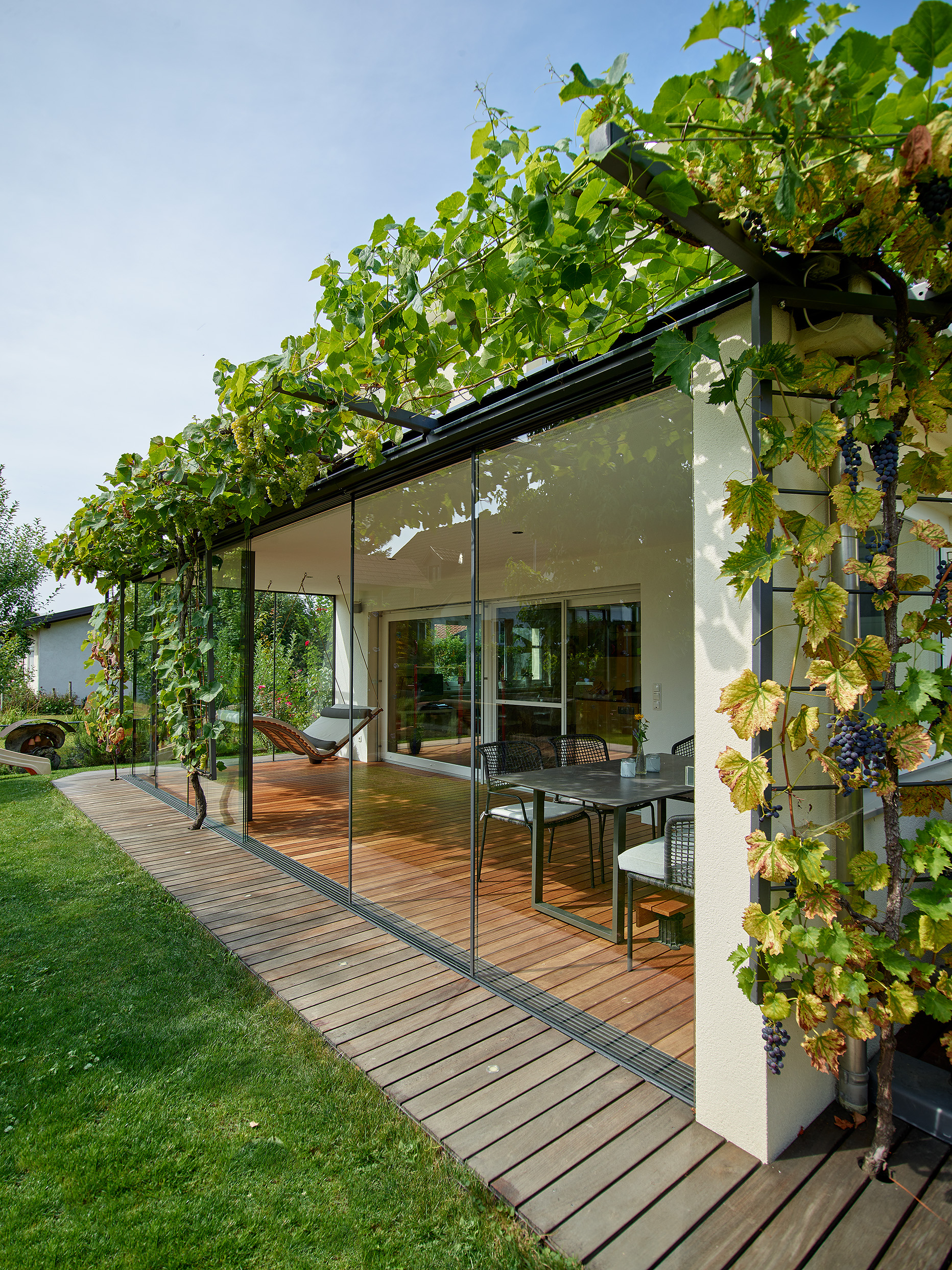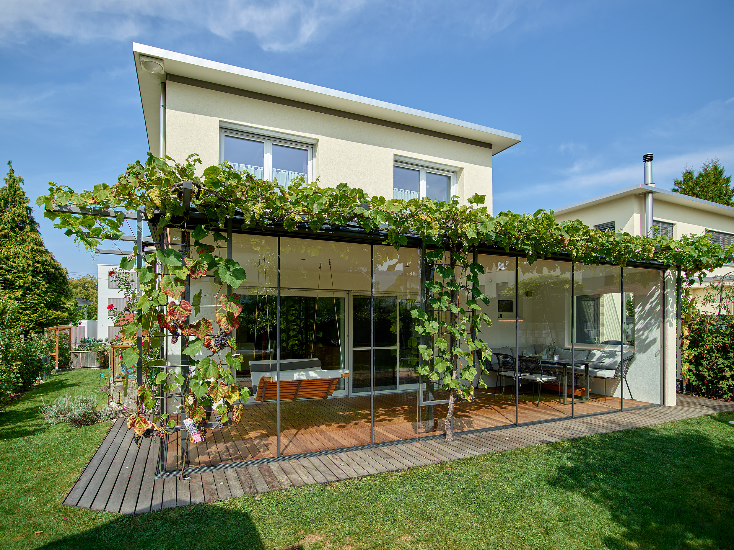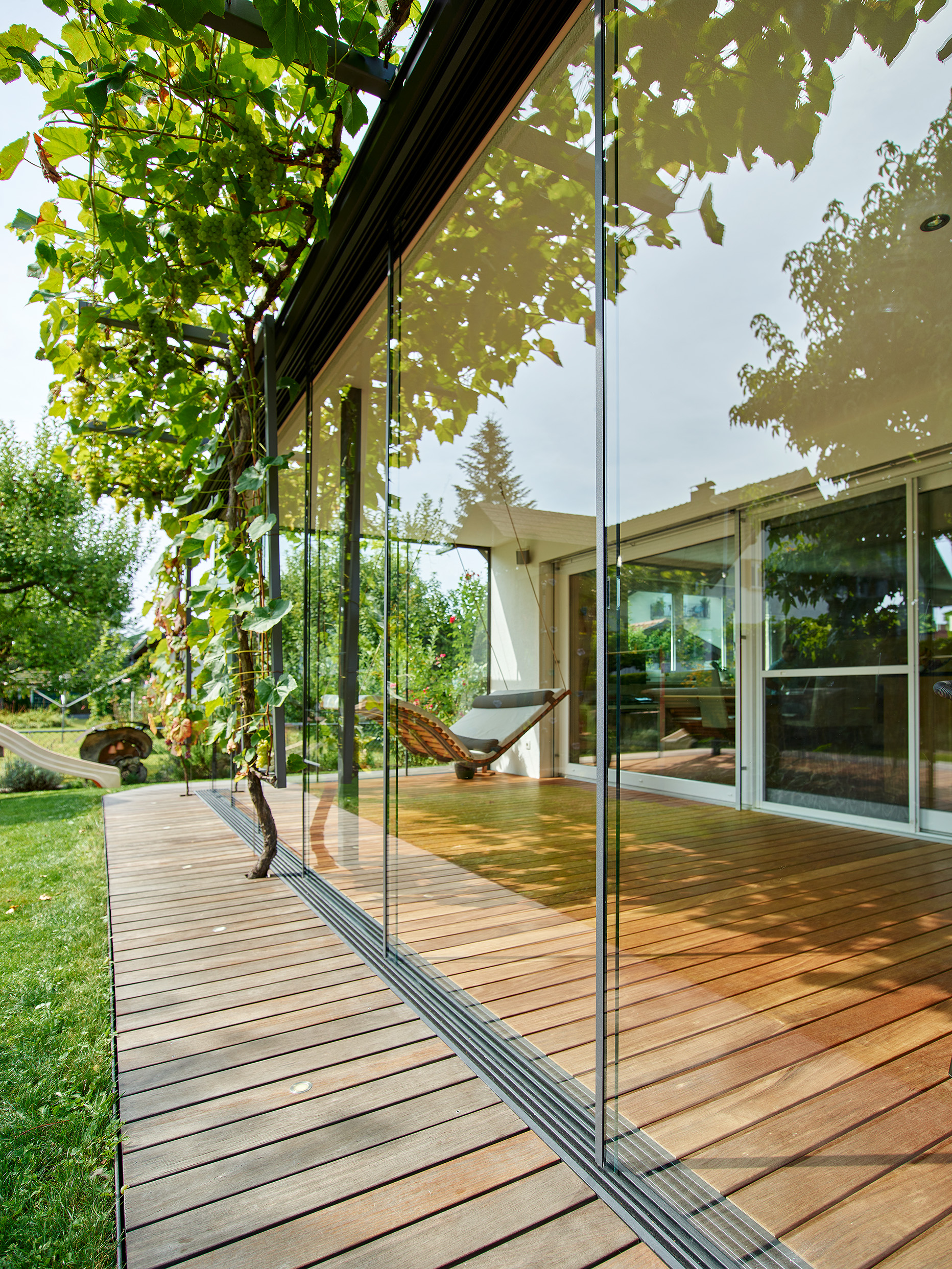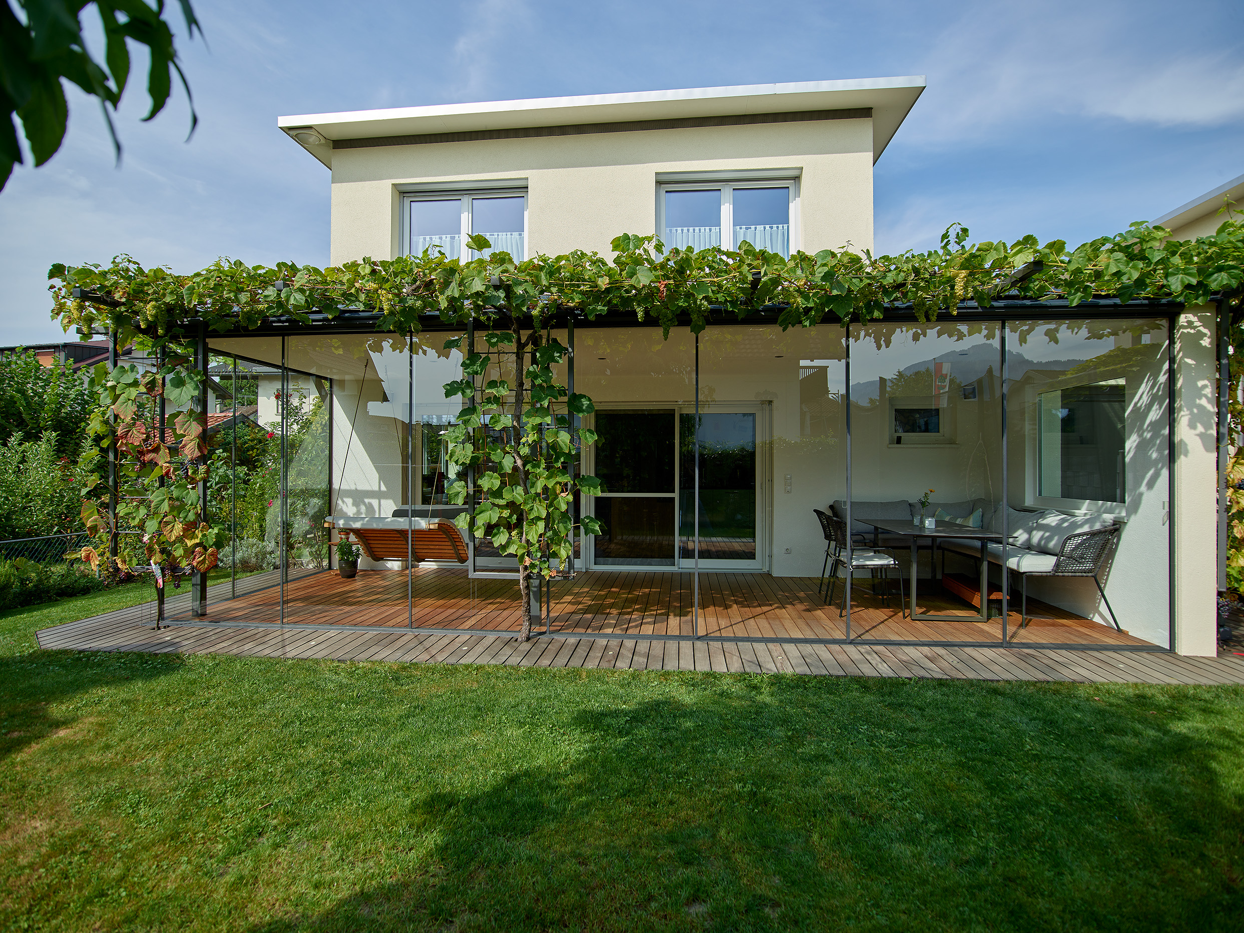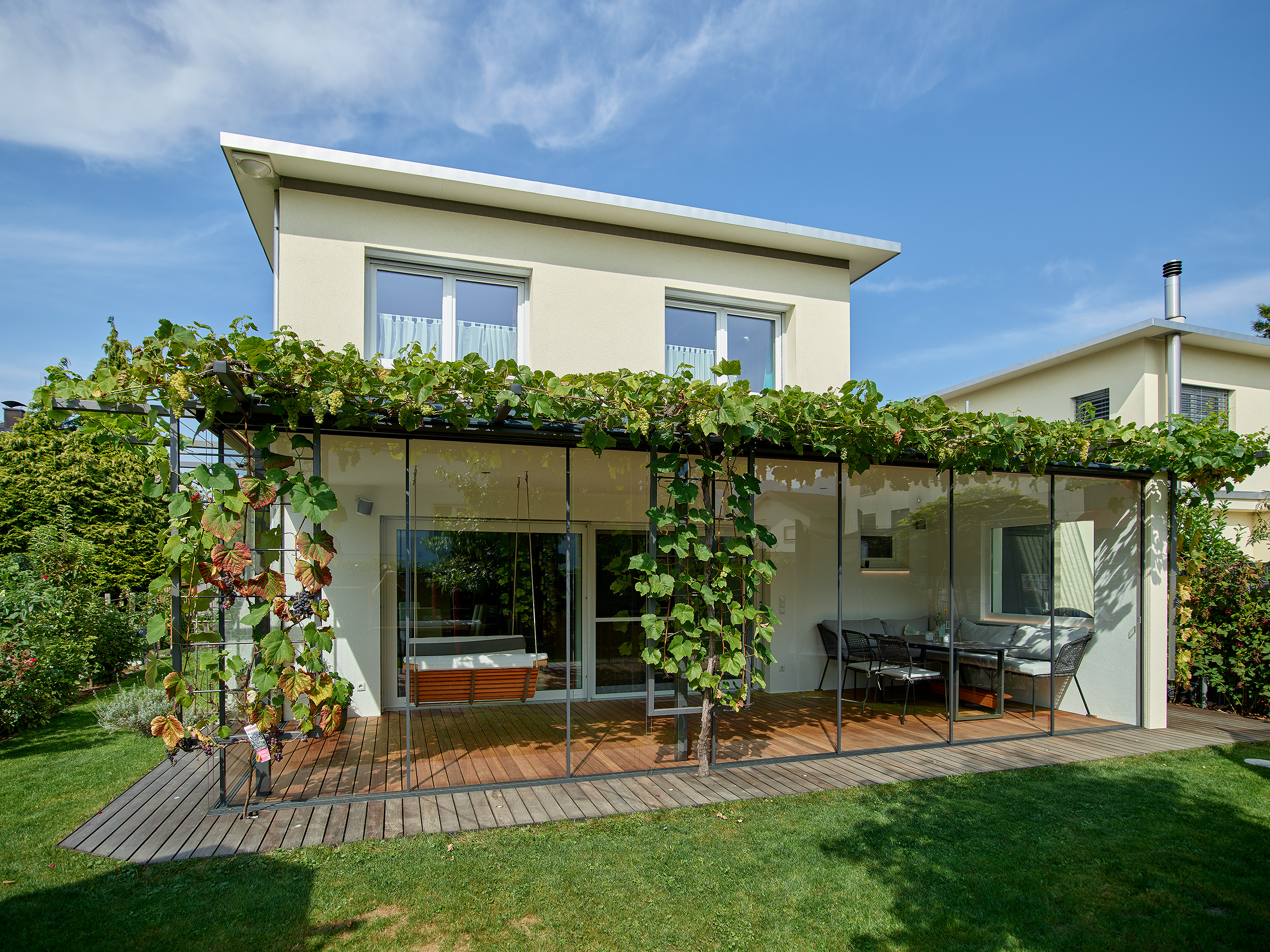 Die Familie R besaß bereits einen überdachten Außenbereich, malerisch umrahmt von wildem Wein. Unsere nachträglich einfachverglasten Schiebeanlagen bieten nun optimalen Schutz vor Wind und Regen, wodurch sich die Nutzungsdauer eines solchen Sitzplatzes erheblich verlängert. Schon im Frühjahr lassen sich die ersten warmen Tage genießen, und im Herbst werden laue Abende geschützt verlängert – ein echter Mehrwert für unser Klima.