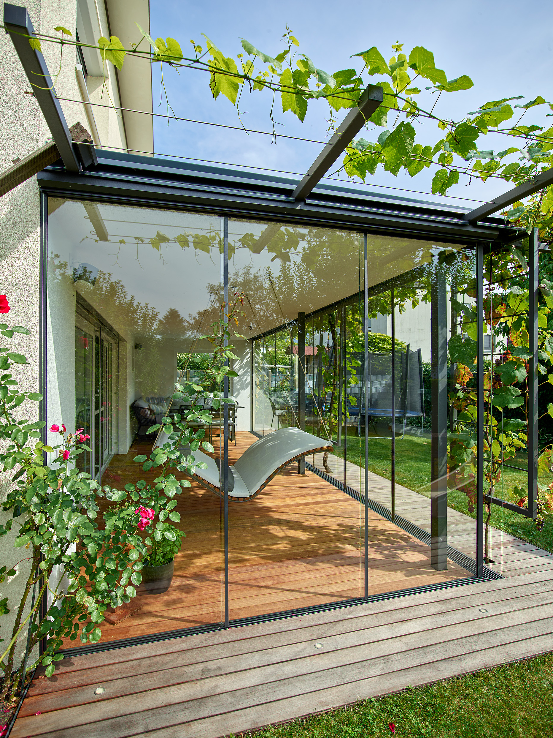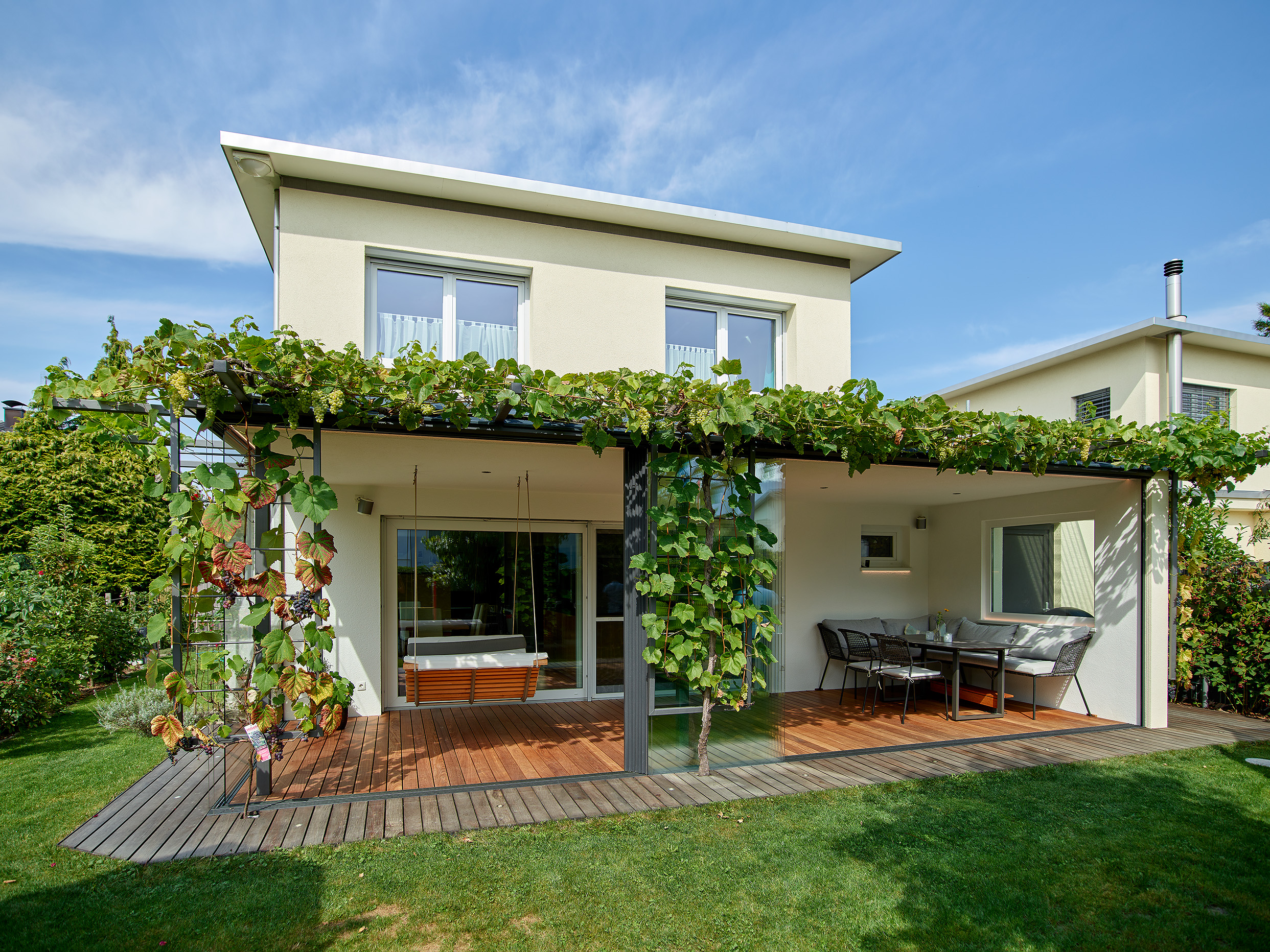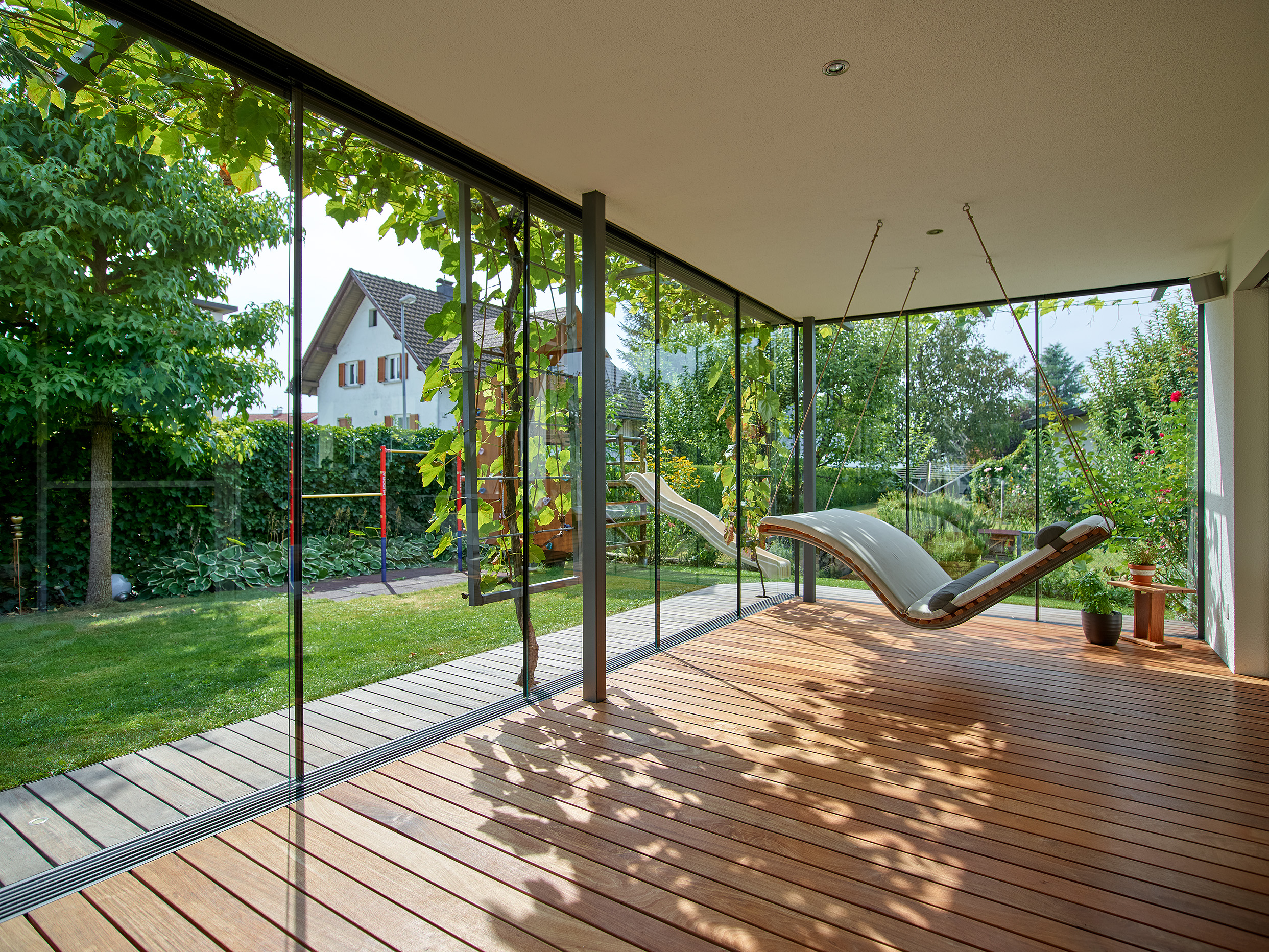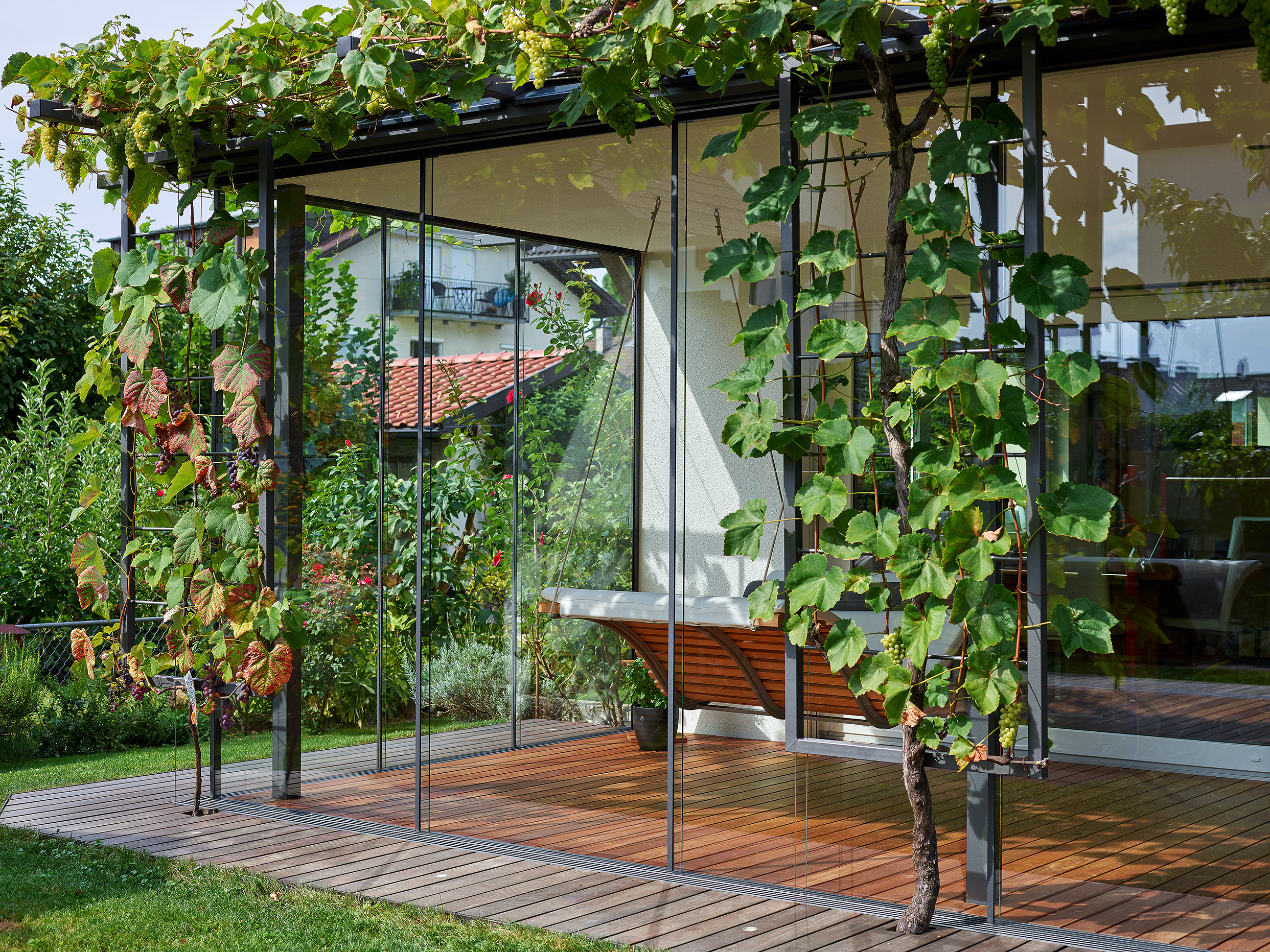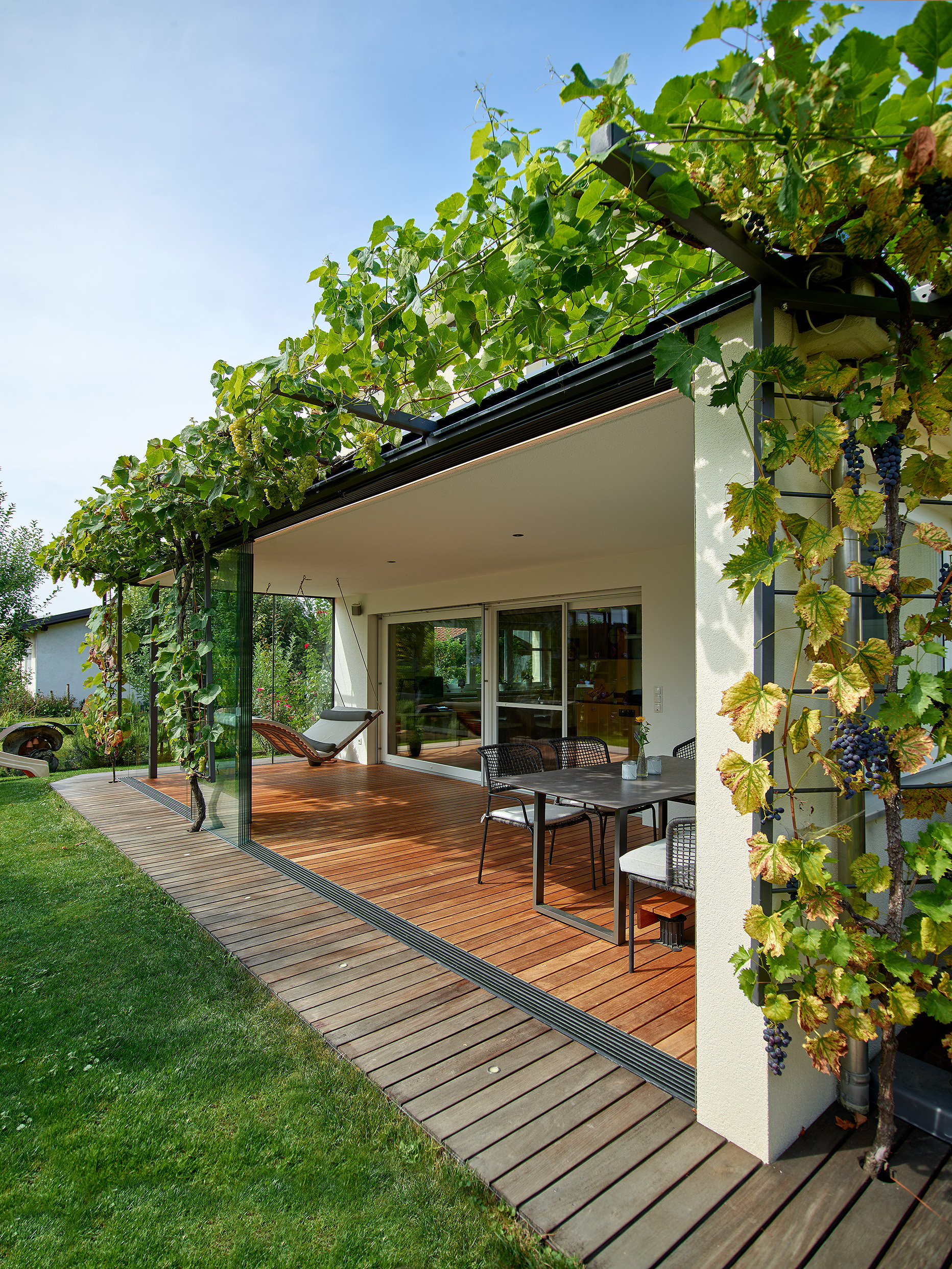 Die Familie R besaß bereits einen überdachten Außenbereich, malerisch umrahmt von wildem Wein. Unsere nachträglich einfachverglasten Schiebeanlagen bieten nun optimalen Schutz vor Wind und Regen, wodurch sich die Nutzungsdauer eines solchen Sitzplatzes erheblich verlängert. Schon im Frühjahr lassen sich die ersten warmen Tage genießen, und im Herbst werden laue Abende geschützt verlängert – ein echter Mehrwert für unser Klima.