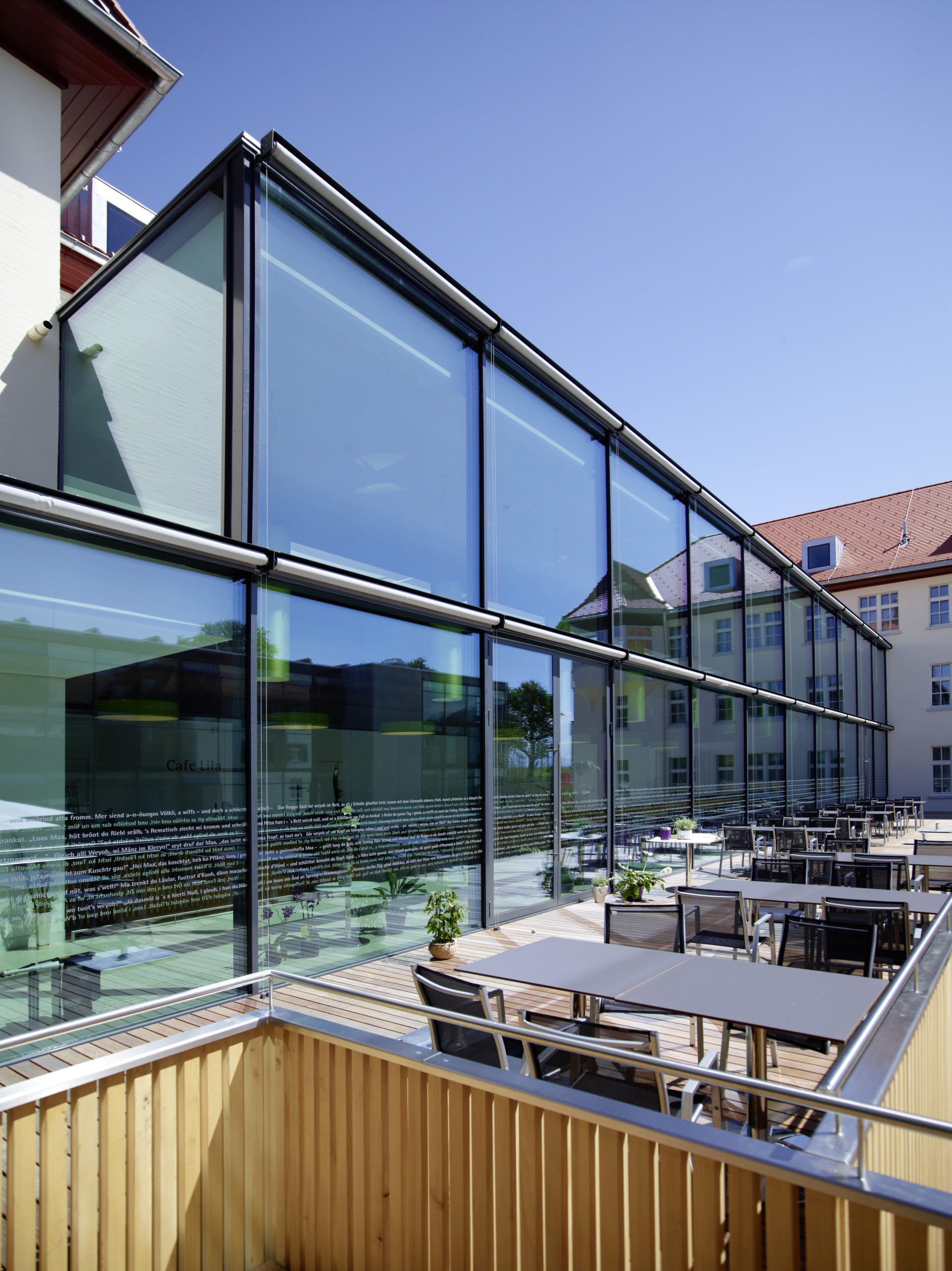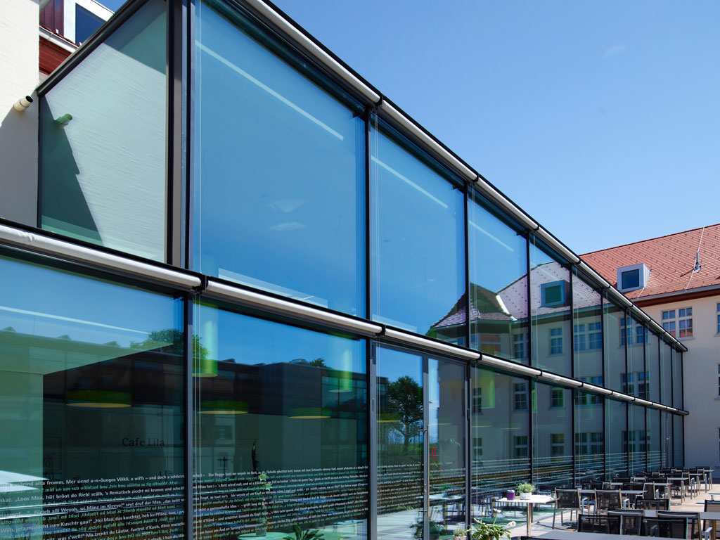 Die bauseitig erstellte Pfosten-Riegel-Stahlkonstruktion wurde von uns mit großflächigen Glaselementen verglast und mittels Klemm- und Deckleisten befestigt. Diese Bauweise ermöglicht beeindruckende Spannweiten und eine lichtdurchflutete Architektur. Die moderne Glasfassade verleiht dem Café des Seniorenheims einen zeitgemäßen, stilvollen Charakter und fügt sich dennoch harmonisch in die bestehende Gebäudestruktur ein.