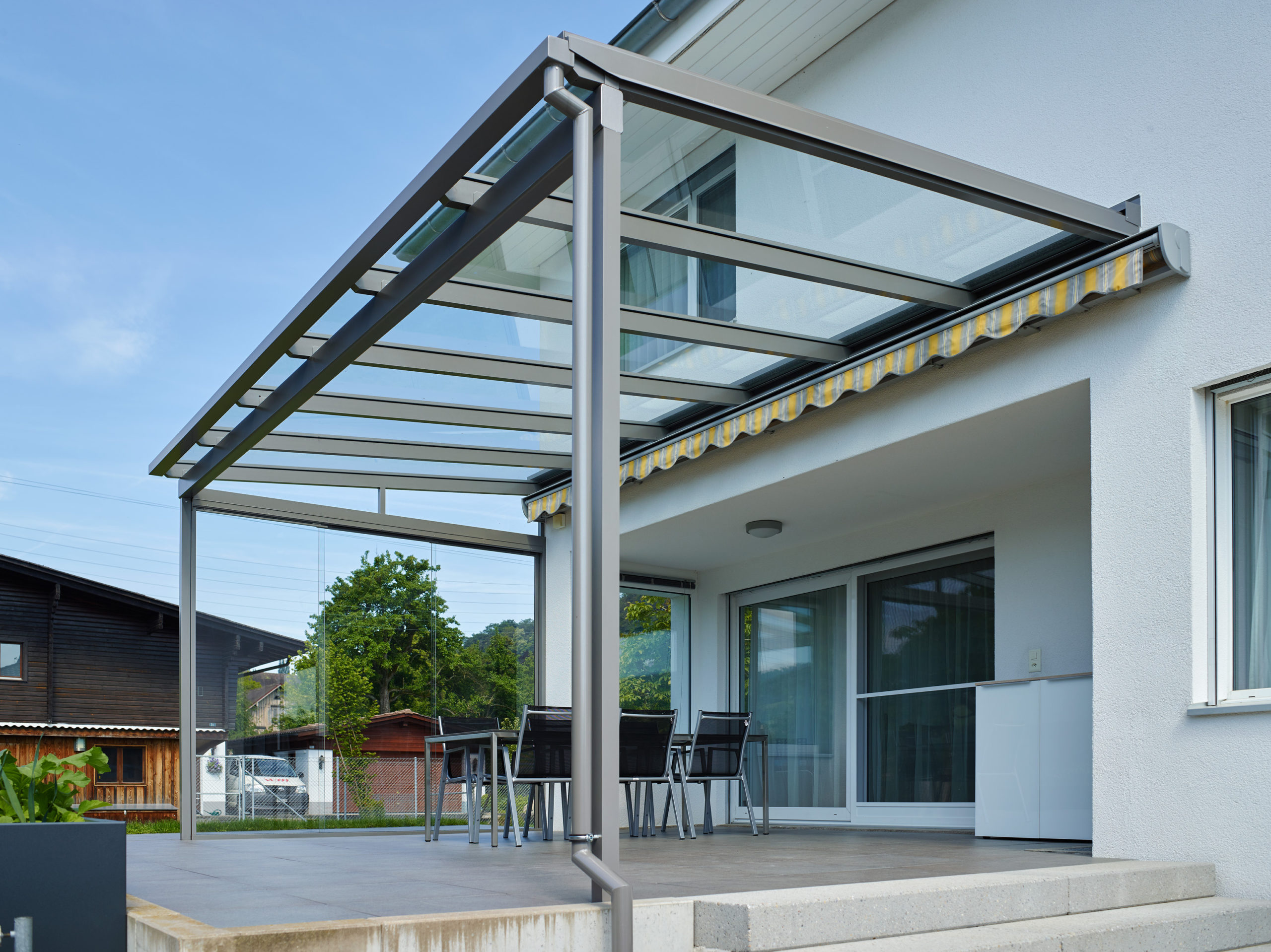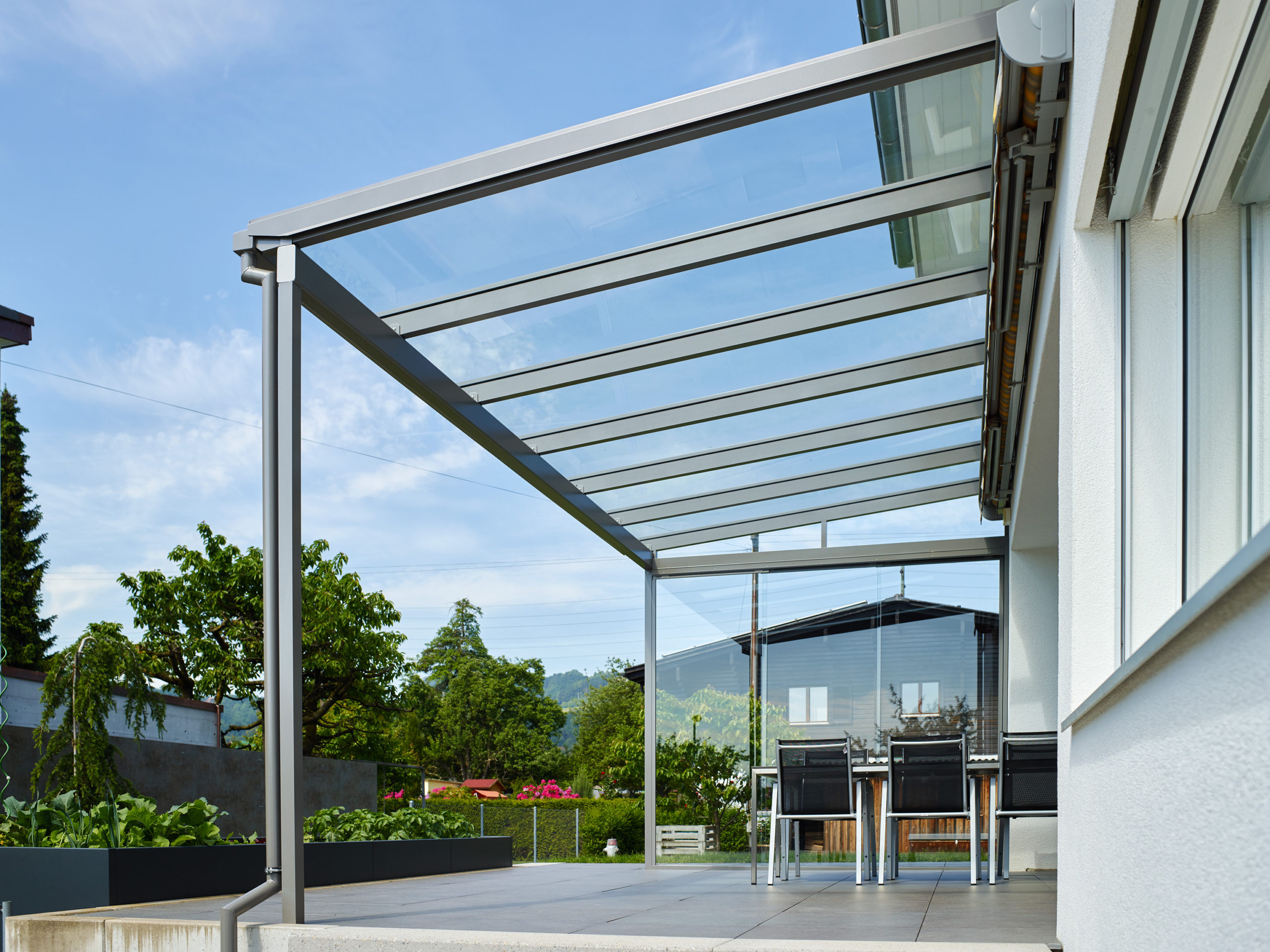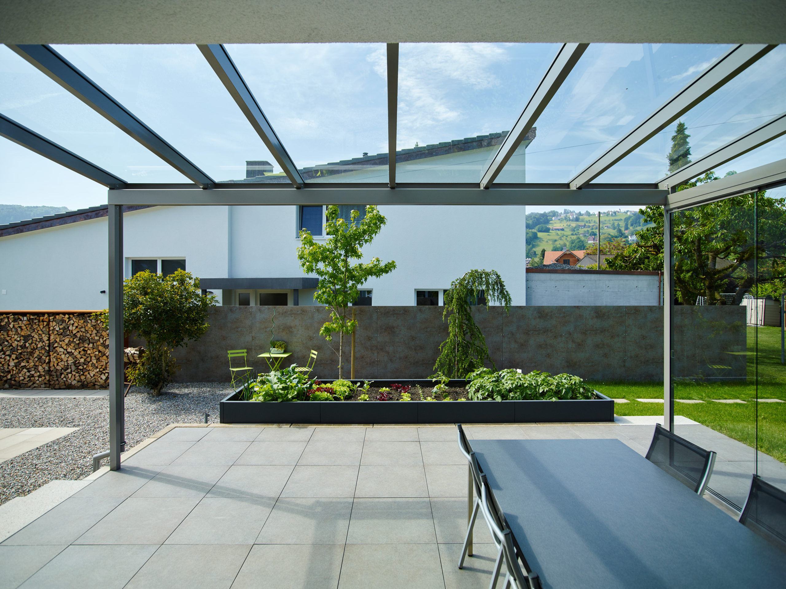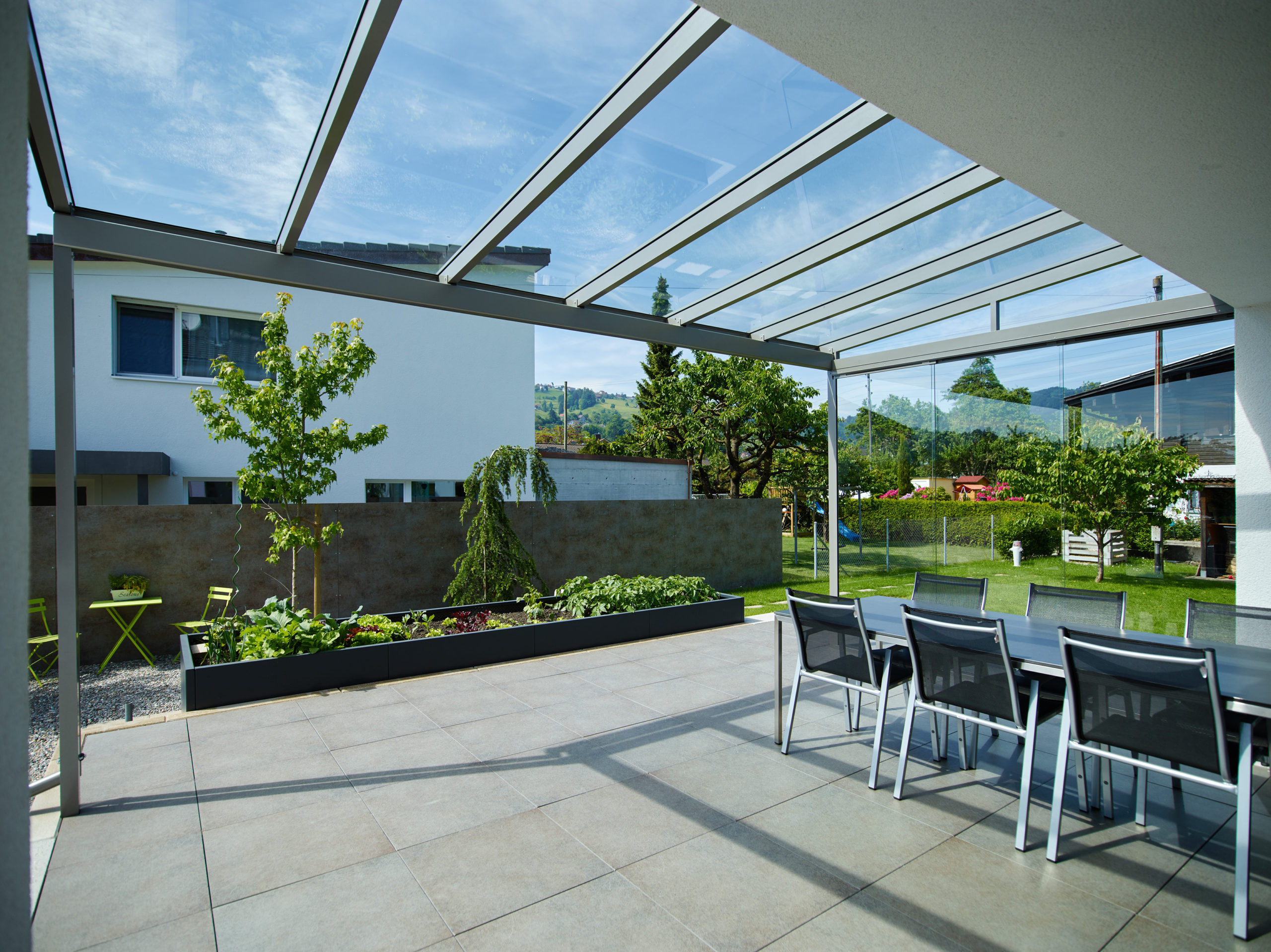 Die klassische Terrassenverglasung, wie sie bei Familie H umgesetzt wurde, vereint Schutz und Flexibilität. Sie besteht aus einer eleganten Dachverglasung sowie einer seitlichen Schiebeanlage. Diese ermöglicht es, die Wetterseite effektiv vor Wind und Regen zu schützen, während sie an heißen Sommertagen geöffnet werden kann, um eine angenehme Luftzirkulation unter der Dachverglasung zu gewährleisten. So entsteht ein geschützter, aber dennoch offener Außenbereich, der sich flexibel an verschiedene Wetterbedingungen anpassen lässt.