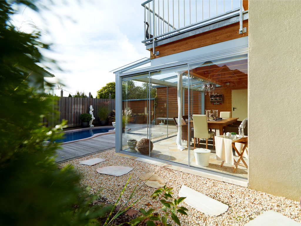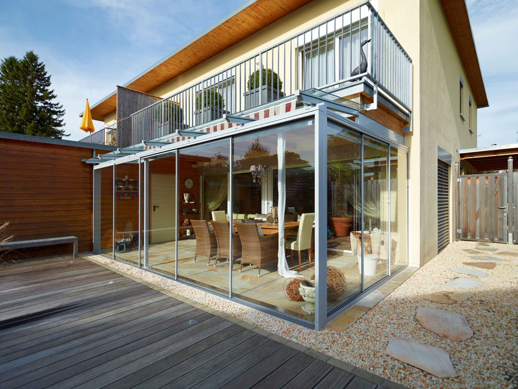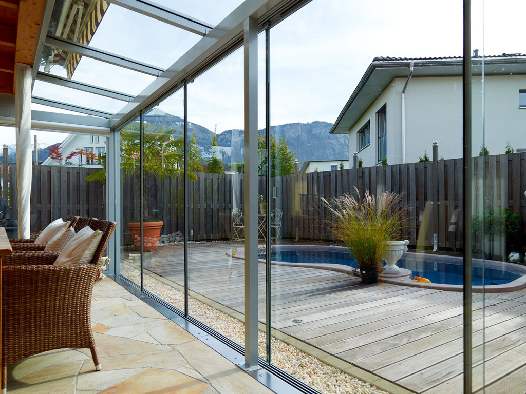 Der einfachverglaste Wintergarten der Familie P wurde äußerst geschmackvoll gestaltet. Der bestehende Balkon wurde mit einer kleinen Dachverglasung erweitert, um die Raumtiefe zu vergrößern. Der Innenbereich ist mit einem edlen Steinboden ausgestattet, während der Übergang zum Außenbereich durch Kies in mediterranen Farbtönen harmonisch gestaltet wurde. Die Dachverglasung wurde ohne Traufrinne ausgeführt, was der Konstruktion eine besonders elegante Note verleiht und den Eindruck erweckt, dass das Dach optisch über den Schiebeanlagen schwebt. So entstehen zahlreiche unvergessliche Stunden rund um den wunderschönen Poolbereich im mediterranen Flair.