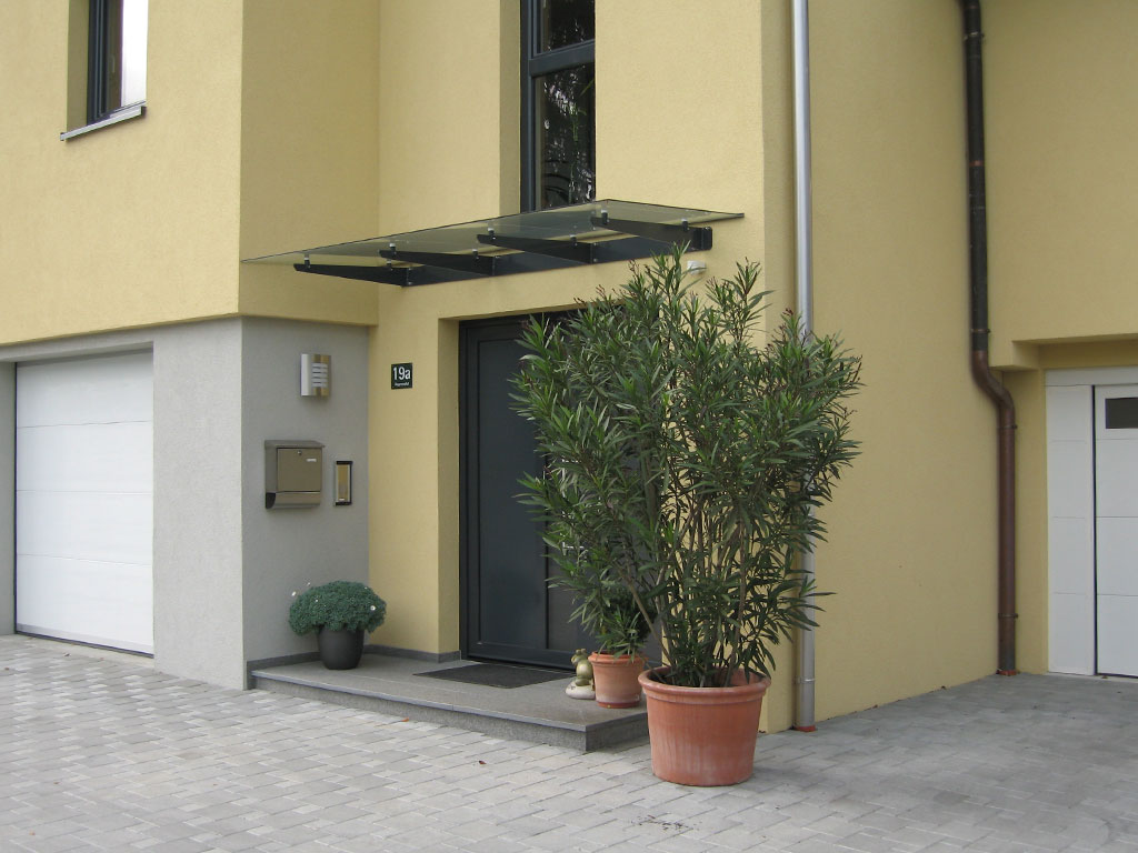 Diese Vordachverglasung wurde als zuverlässiger Schutz vor Wind und Wetter vor dem Hauseingang der Familie G installiert. So kann die Haustüre komfortabel im Trockenen aufgeschlossen und Gäste geschützt empfangen werden. Darüber hinaus bietet das Vordach zusätzlichen Schutz für den Postkasten, die Klingel, Dekorationselemente und die Hauswand. Die Schwertkonstruktion aus Stahl überzeugt nicht nur durch ihre Stabilität, sondern auch durch ihre individuelle Gestaltungsfreiheit. Die Farbe kann passend zur Haustüre oder zur Fassade gewählt werden – wie bei diesem Objekt, bei dem sie harmonisch in das Gesamtbild des Eingangsbereichs integriert wurde.
