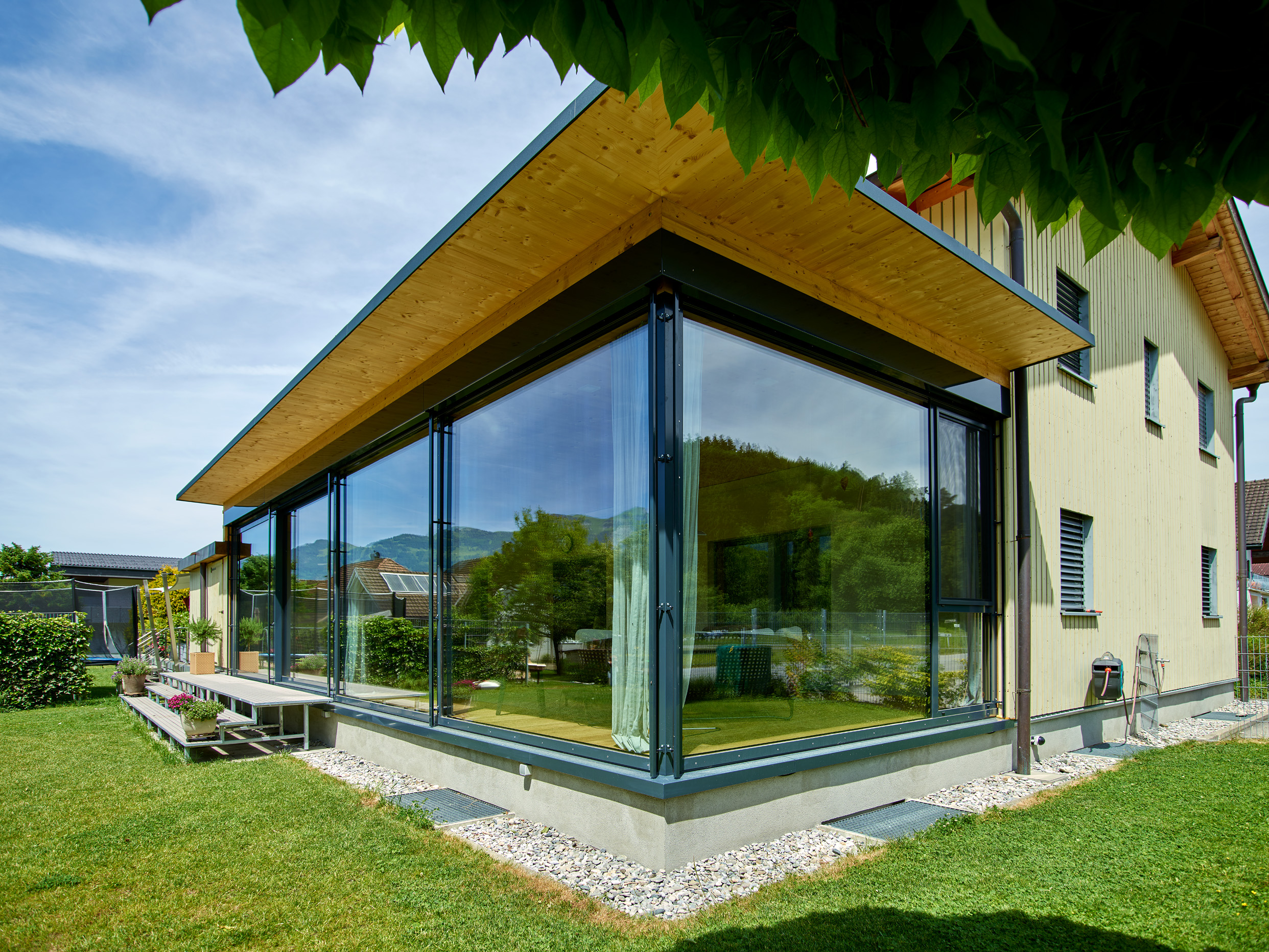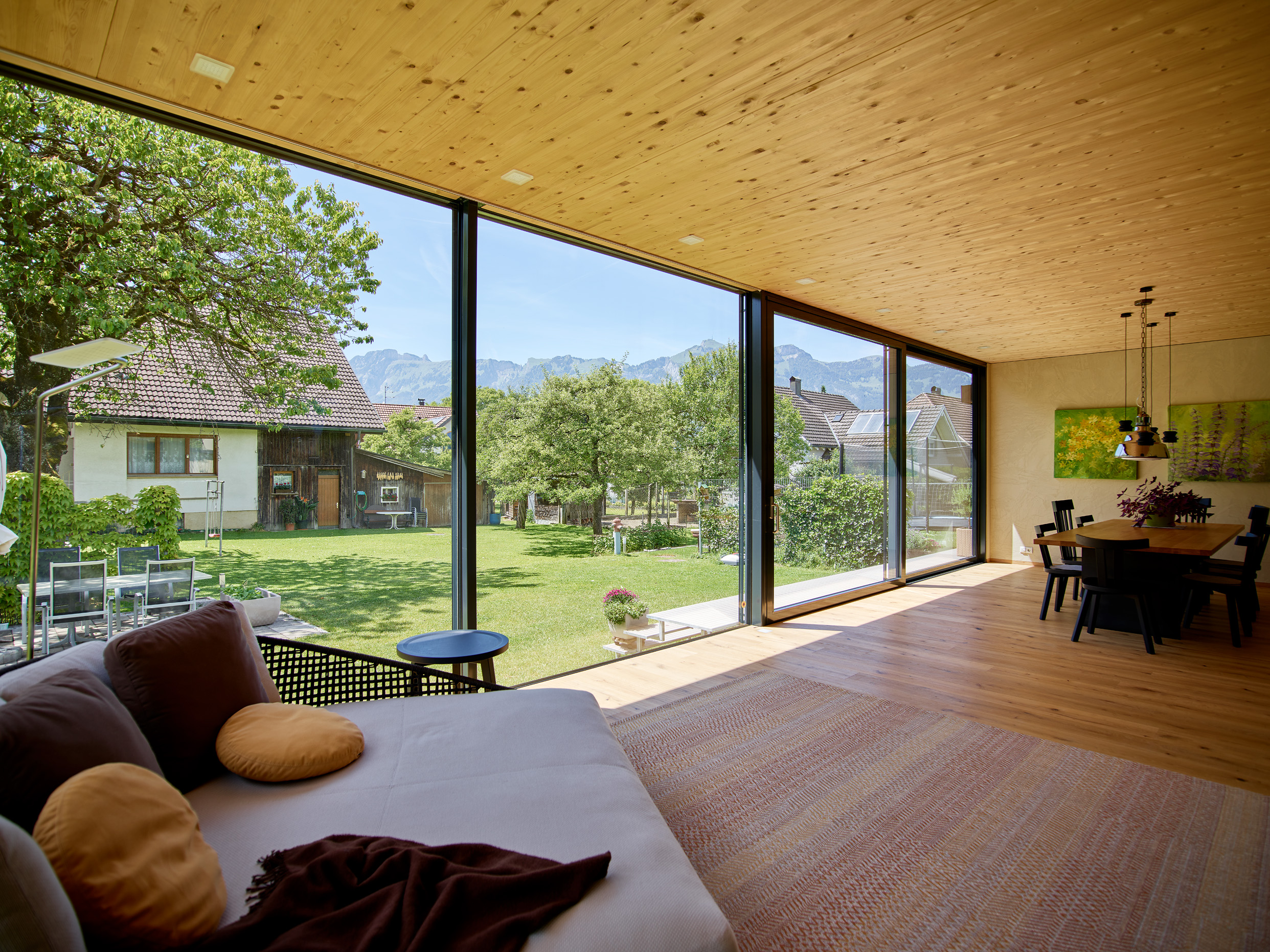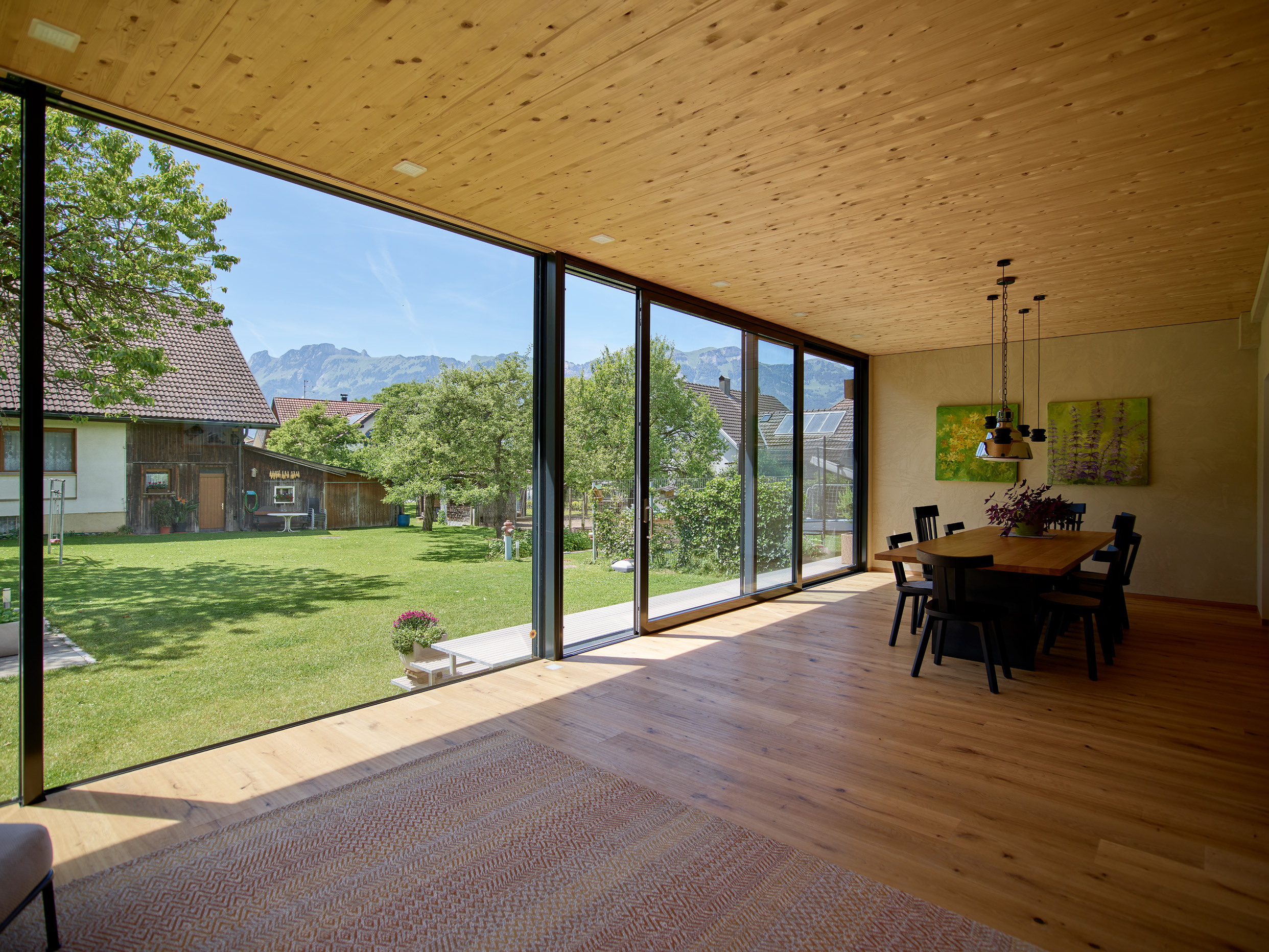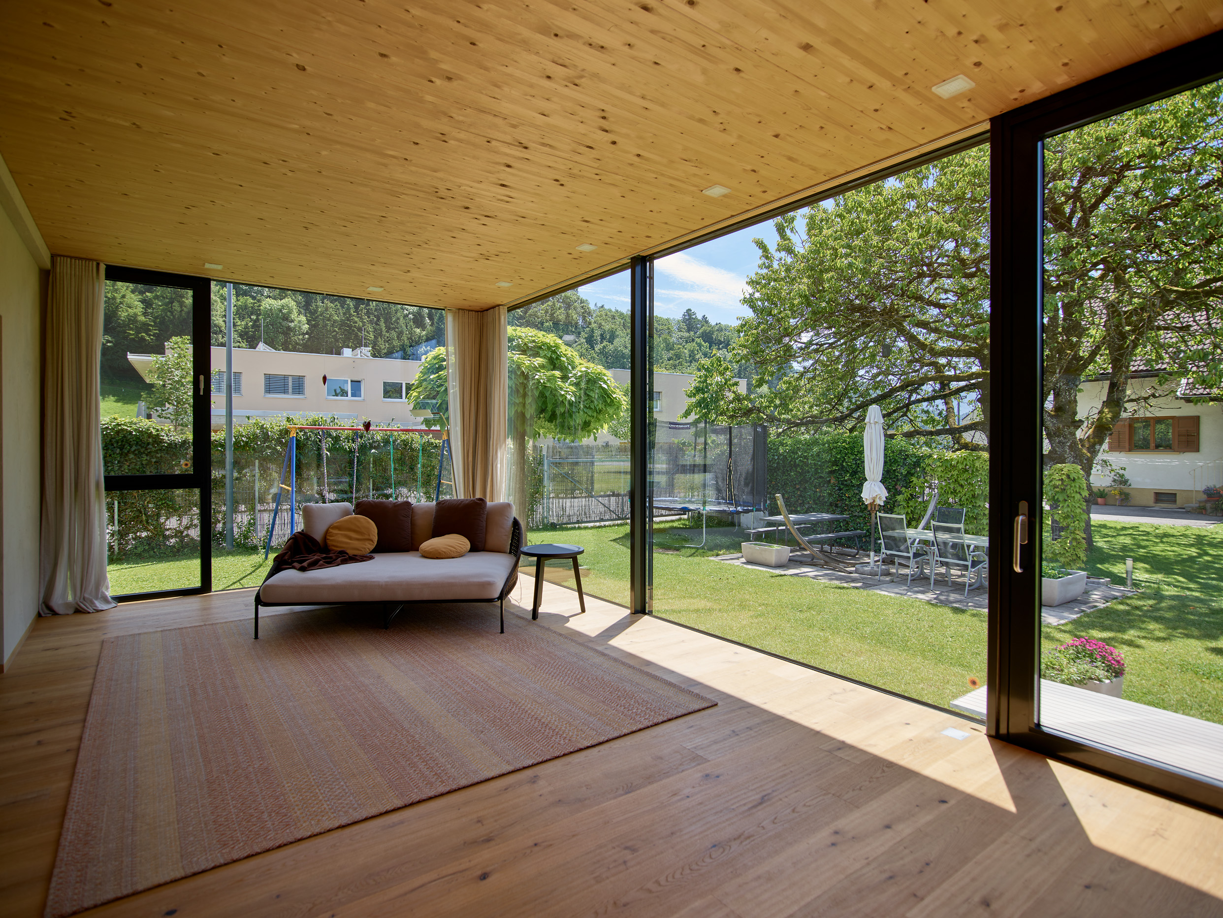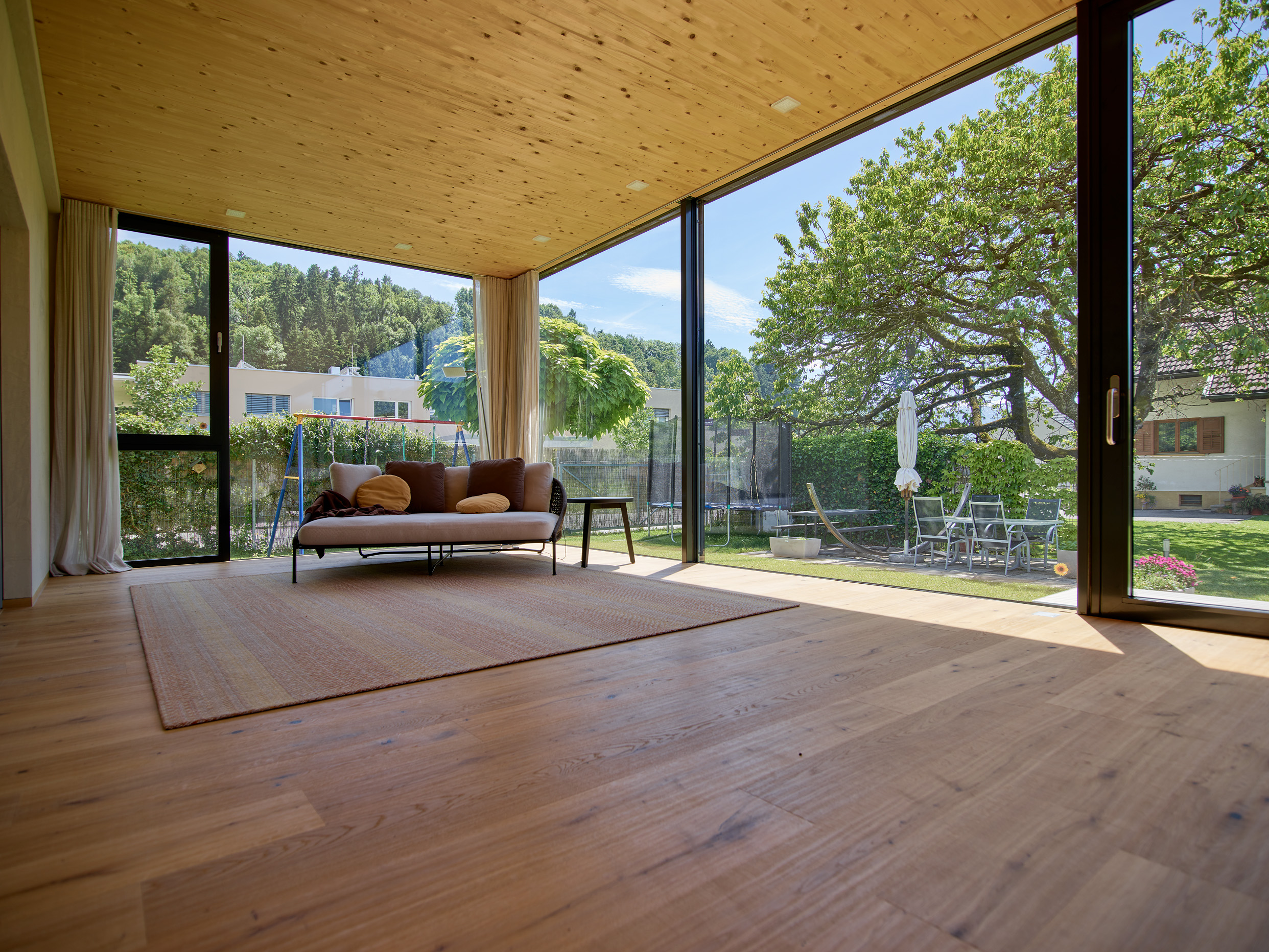 Der großzügige Wohnraumwintergarten der Familie S in Feldkirch schafft zusätzlichen Raum für einen eleganten Loungebereich sowie einen großzügigen Esstisch. Der Anbau wurde mit einem modernen Flachdach realisiert und harmonisch in den Bestand integriert, wobei die Außenwände in stilvolle Lehmwände umgestaltet wurden. Der direkte Zugang zum Garten erfolgt über eine weitläufige Stahltreppe sowie eine große Hebe-Schiebeanlage. Dieser lichtdurchflutete Raum inmitten der Natur steigert die Wohnqualität spürbar und schafft ein einzigartiges Wohngefühl.